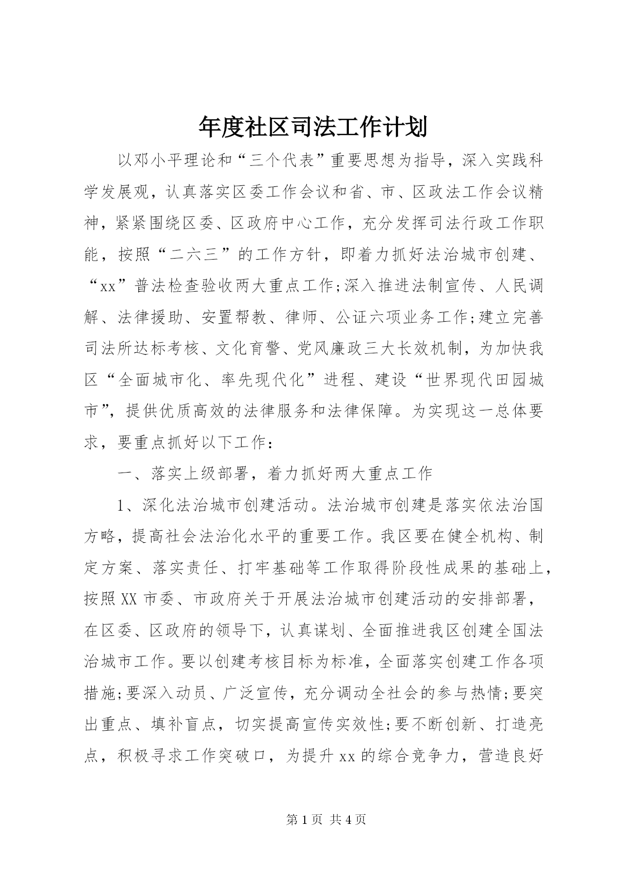 第PAGE\*Arabic\*MERGEFORMAT4页共NUMPAGES\*MERGEFORMAT4页年度社区司法工作计划以邓小平理论和“三个代表”重要思想为指导,深入实践科学发展观,认真落实区委工作会议和省、市、区政法工作会议精神,紧紧围绕区委、区政府中心工作,充分发挥司法行政工作职能,按照“二六三”的工作方针,即着力抓好法治城市创建、“xx”普法检查验收两大重点工作;深入推进法制宣传、人民调解、法律援助、安置帮教、律师、公证六项业务工作;建立完善司法所达标考核、文化育警、党风廉政三大长效