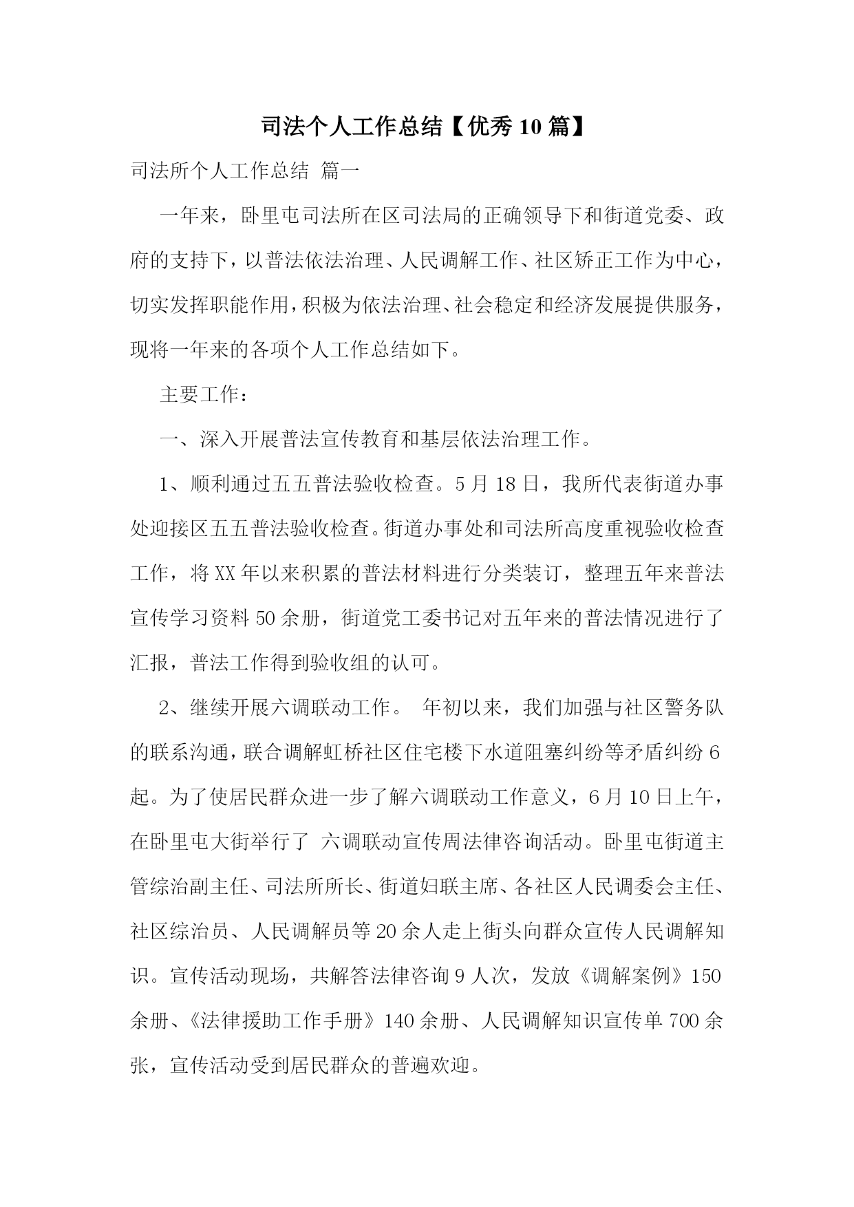 司法个人工作总结【优秀10篇】司法所个人工作总结篇一一年来,卧里屯司法所在区司法局的正确领导下和街道党委、政府的支持下,以普法依法治理、人民调解工作、社区矫正工作为中心,切实发挥职能作用,积极为依法治理、社会稳定和经济发展提供服务,现将一年来的各项个人工作总结如下。主要工作:一、深入开展普法宣传教育和基层依法治理工作。1、顺利通过五五普法验收检查。5月18日,我所代表街道办事处迎接区五五普法验收检查。街道办事处和司法所高度重视验收检查工作,将XX年以来积累的普法材料进行分类装订,整理五年来普法宣传学习资料