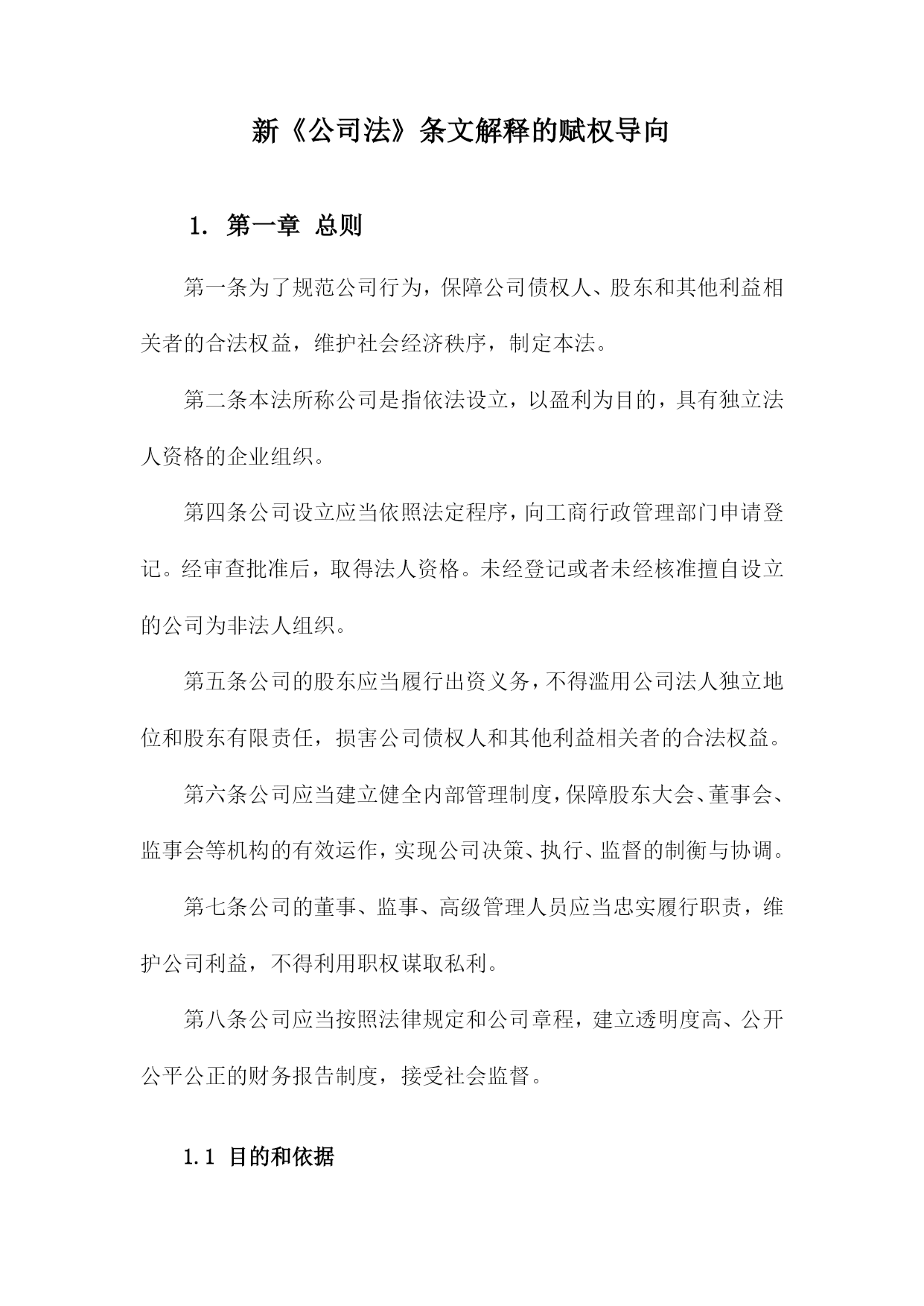 新《公司法》条文解释的赋权导向1.第一章总则第一条为了规范公司行为,保障公司债权人、股东和其他利益相关者的合法权益,维护社会经济秩序,制定本法。第二条本法所称公司是指依法设立,以盈利为目的,具有独立法人资格的企业组织。第四条公司设立应当依照法定程序,向工商行政管理部门申请登记。经审查批准后,取得法人资格。未经登记或者未经核准擅自设立的公司为非法人组织。第五条公司的股东应当履行出资义务,不得滥用公司法人独立地位和股东有限责任,损害公司债权人和其他利益相关者的合法权益。第六条公司应当建立健全内部管理制度,保障