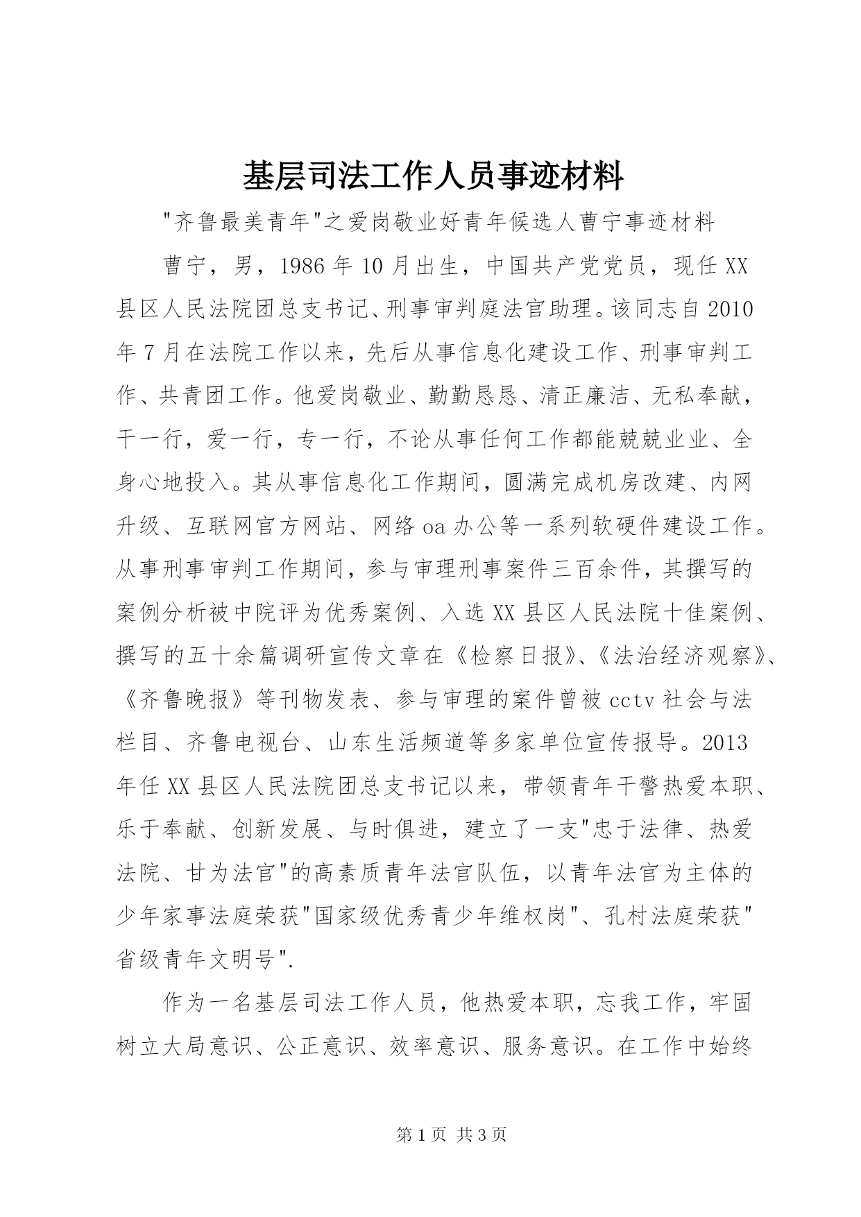 第PAGE\*Arabic\*MERGEFORMAT3页共NUMPAGES\*MERGEFORMAT3页基层司法工作人员事迹材料"齐鲁最美青年"之爱岗敬业好青年候选人曹宁事迹材料曹宁,男,1986年10月出生,中国共产党党员,现任XX县区人民法院团总支书记、刑事审判庭法官助理。该同志自2010年7月在法院工作以来,先后从事信息化建设工作、刑事审判工作、共青团工作。他爱岗敬业、勤勤恳恳、清正廉洁、无私奉献,干一行,爱一行,专一行,不论从事任何工作都能兢兢业业、全身心地投入。其从事信息化工作期间,