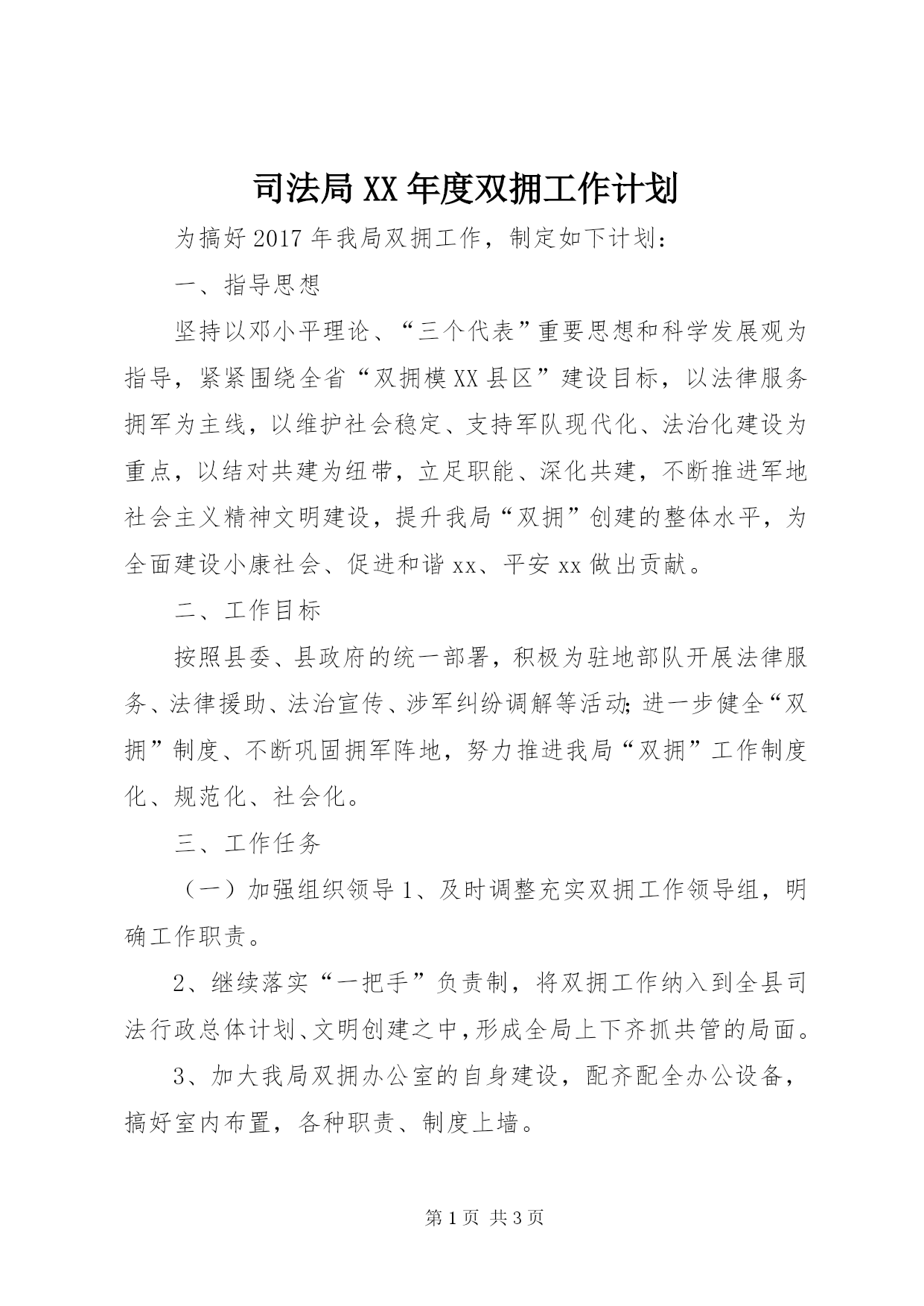 第PAGE\*Arabic\*MERGEFORMAT3页共NUMPAGES\*MERGEFORMAT3页司法局XX年度双拥工作计划为搞好2017年我局双拥工作,制定如下计划:一、指导思想坚持以邓小平理论、“三个代表”重要思想和科学发展观为指导,紧紧围绕全省“双拥模XX县区”建设目标,以法律服务拥军为主线,以维护社会稳定、支持军队现代化、法治化建设为重点,以结对共建为纽带,立足职能、深化共建,不断推进军地社会主义精神文明建设,提升我局“双拥”创建的整体水平,为全面建设小康社会、促进和谐xx、平安