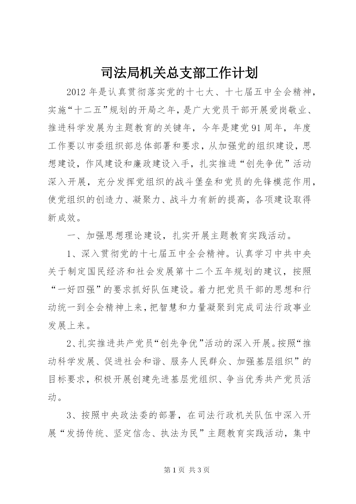 第PAGE\*Arabic\*MERGEFORMAT3页共NUMPAGES\*MERGEFORMAT3页司法局机关总支部工作计划2012年是认真贯彻落实党的十七大、十七届五中全会精神,实施“十二五”规划的开局之年,是广大党员干部开展爱岗敬业、推进科学发展为主题教育的关键年,今年是建党91周年,年度工作要以市委组织部总体部署和要求,从加强党的组织建设,思想建设,作风建设和廉政建设入手,扎实推进“创先争优”活动深入开展,充分发挥党组织的战斗堡垒和党员的先锋模范作用,使党组织的创造力、凝聚力、战斗力