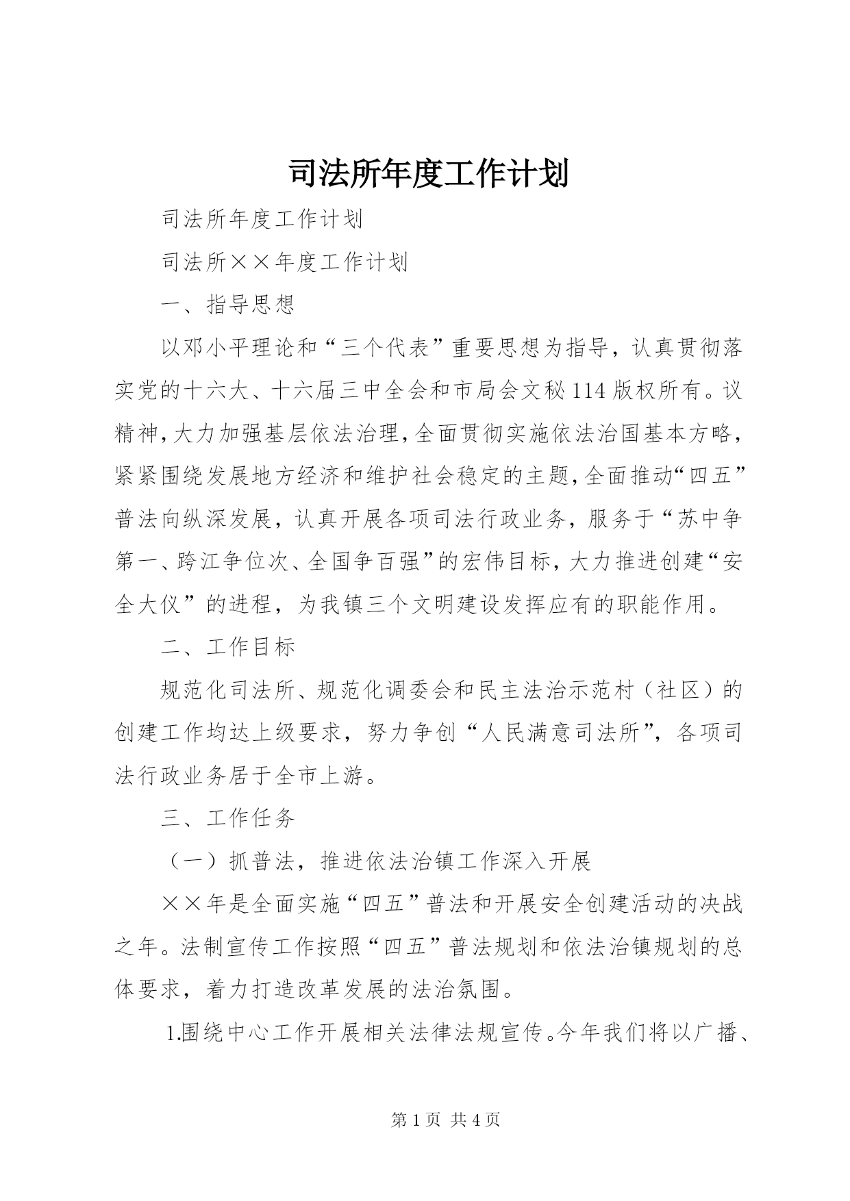 第PAGE\*Arabic\*MERGEFORMAT4页共NUMPAGES\*MERGEFORMAT4页司法所年度工作计划司法所年度工作计划司法所××年度工作计划一、指导思想以邓小平理论和“三个代表”重要思想为指导,认真贯彻落实党的十六大、十六届三中全会和市局会文秘114版权所有。议精神,大力加强基层依法治理,全面贯彻实施依法治国基本方略,紧紧围绕发展地方经济和维护社会稳定的主题,全面推动“四五”普法向纵深发展,认真开展各项司法行政业务,服务于“苏中争第一、跨江争位次、全国争百强”的宏伟目标,