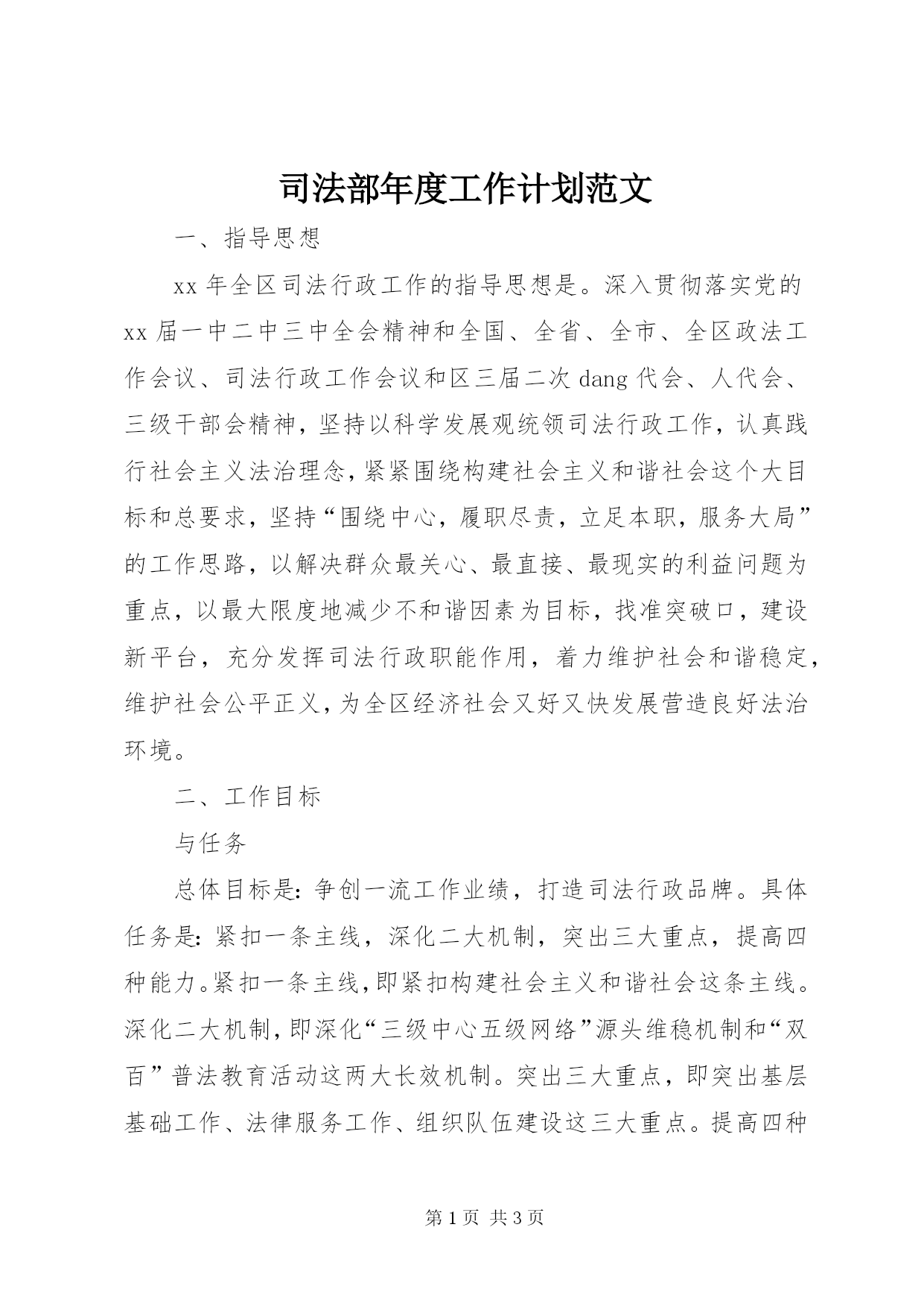 第PAGE\*Arabic\*MERGEFORMAT3页共NUMPAGES\*MERGEFORMAT3页司法部年度工作计划范文一、指导思想xx年全区司法行政工作的指导思想是。深入贯彻落实党的xx届一中二中三中全会精神和全国、全省、全市、全区政法工作会议、司法行政工作会议和区三届二次dang代会、人代会、三级干部会精神,坚持以科学发展观统领司法行政工作,认真践行社会主义法治理念,紧紧围绕构建社会主义和谐社会这个大目标和总要求,坚持“围绕中心,履职尽责,立足本职,服务大局”的工作思路,以解决群众最