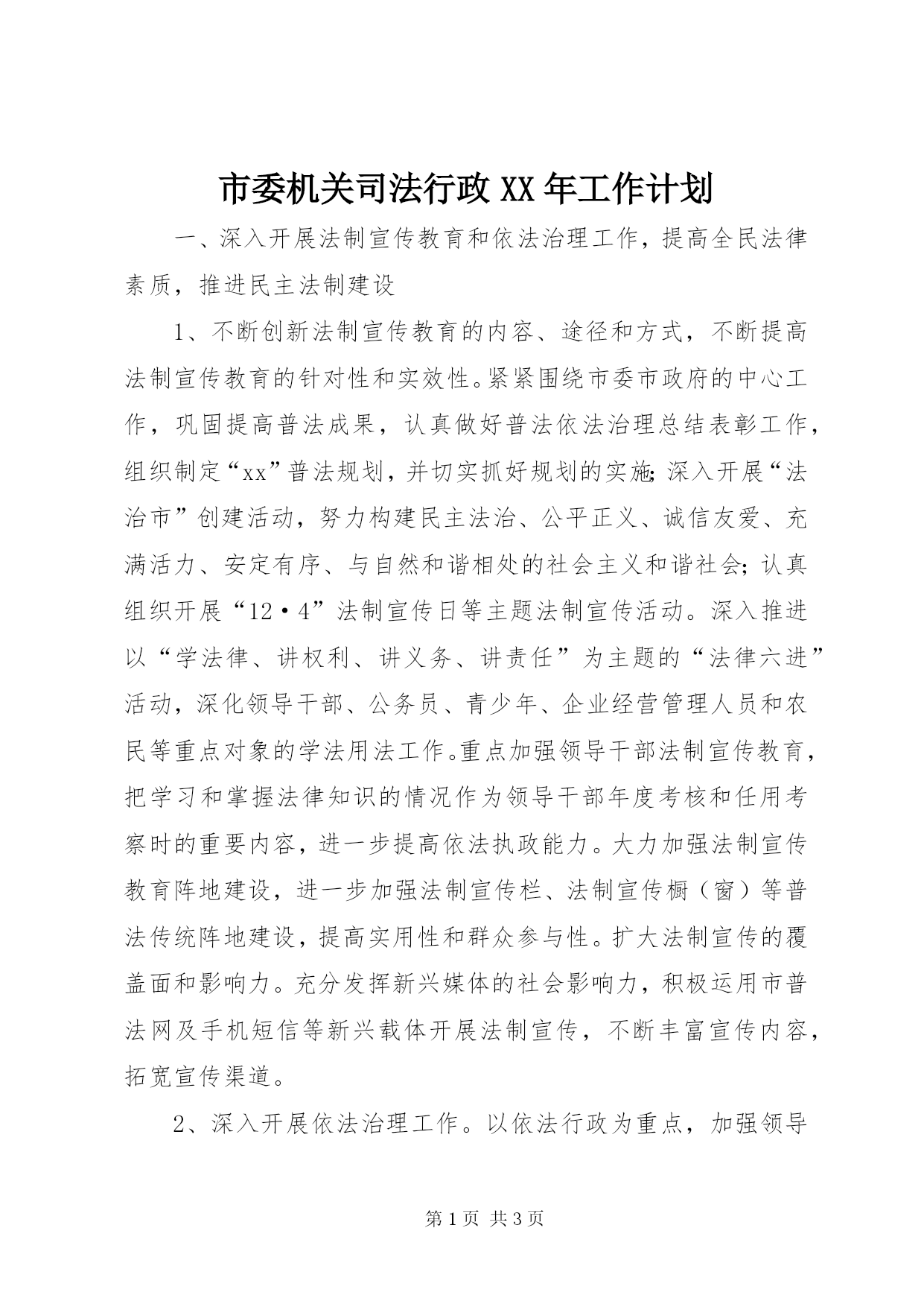 第PAGE\*Arabic\*MERGEFORMAT3页共NUMPAGES\*MERGEFORMAT3页市委机关司法行政XX年工作计划一、深入开展法制宣传教育和依法治理工作,提高全民法律素质,推进民主法制建设1、不断创新法制宣传教育的内容、途径和方式,不断提高法制宣传教育的针对性和实效性。紧紧围绕市委市政府的中心工作,巩固提高普法成果,认真做好普法依法治理总结表彰工作,组织制定“xx”普法规划,并切实抓好规划的实施;深入开展“法治市”创建活动,努力构建民主法治、公平正义、诚信友爱、充满活力、安