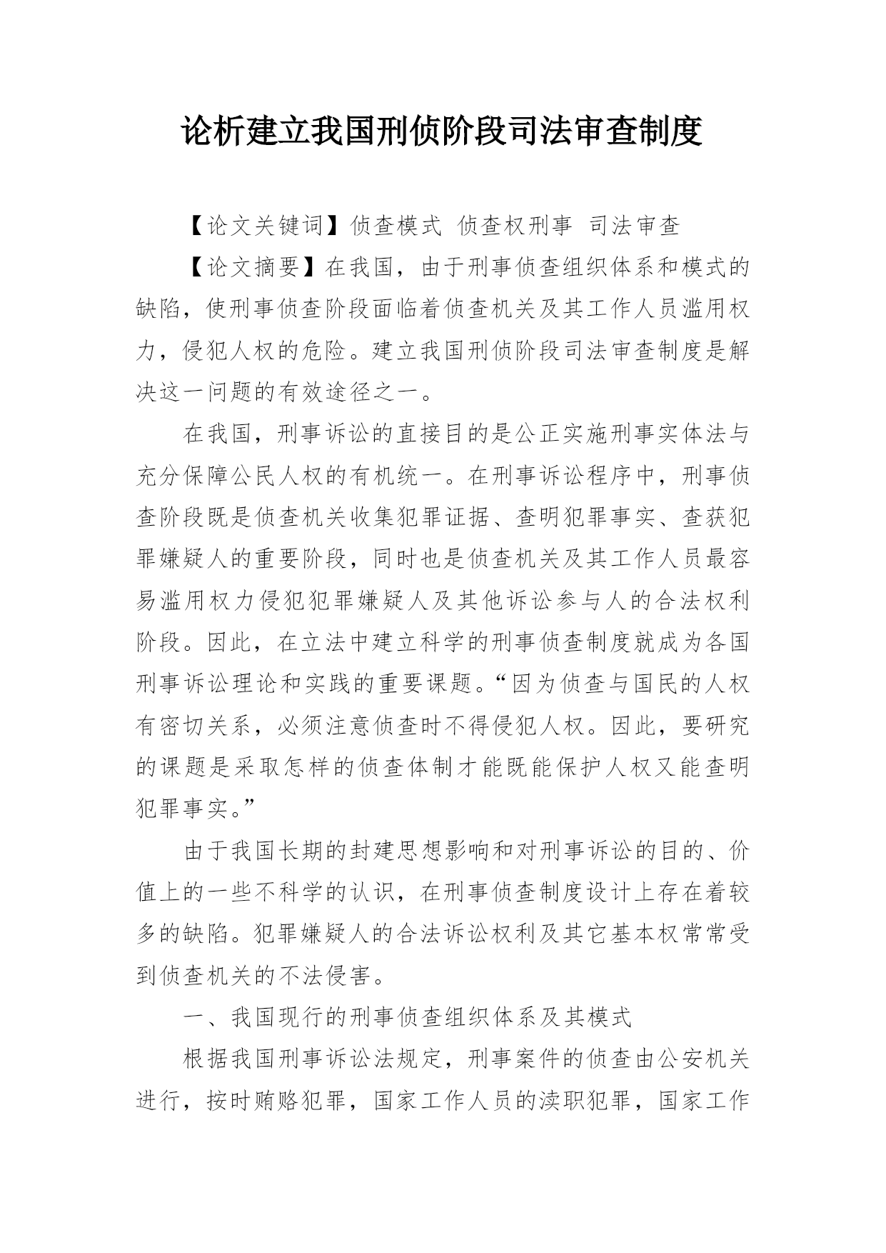 论析建立我国刑侦阶段司法审查制度【论文关键词】侦查模式侦查权刑事司法审查【论文摘要】在我国,由于刑事侦查组织体系和模式的缺陷,使刑事侦查阶段面临着侦查机关及其工作人员滥用权力,侵犯人权的危险。建立我国刑侦阶段司法审查制度是解决这一问题的有效途径之一。在我国,刑事诉讼的直接目的是公正实施刑事实体法与充分保障公民人权的有机统一。在刑事诉讼程序中,刑事侦查阶段既是侦查机关收集犯罪证据、查明犯罪事实、查获犯罪嫌疑人的重要阶段,同时也是侦查机关及其工作人员最容易滥用权力侵犯犯罪嫌疑人及其他诉讼参与人的合法权利阶段。