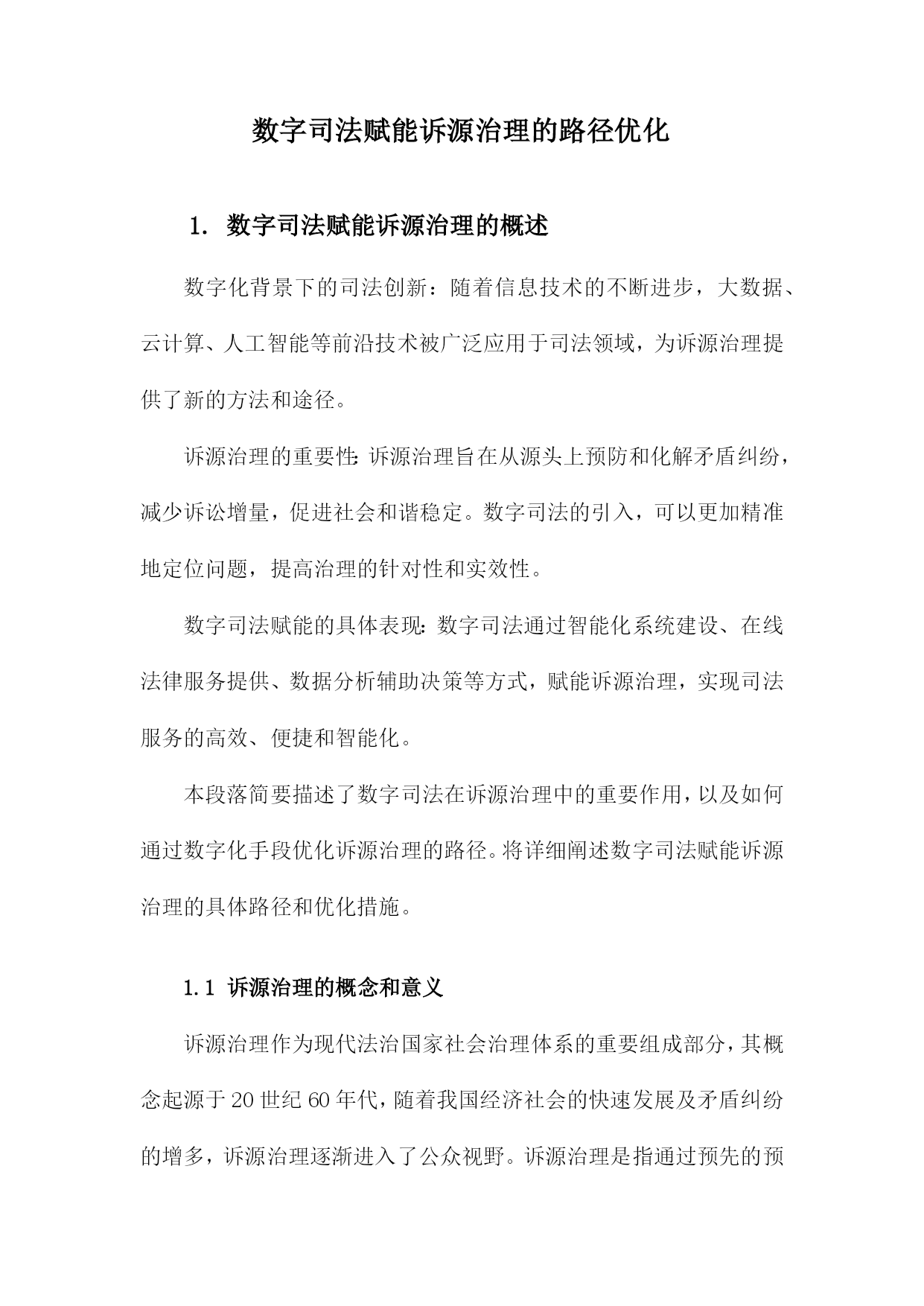 数字司法赋能诉源治理的路径优化1.数字司法赋能诉源治理的概述数字化背景下的司法创新:随着信息技术的不断进步,大数据、云计算、人工智能等前沿技术被广泛应用于司法领域,为诉源治理提供了新的方法和途径。诉源治理的重要性:诉源治理旨在从源头上预防和化解矛盾纠纷,减少诉讼增量,促进社会和谐稳定。数字司法的引入,可以更加精准地定位问题,提高治理的针对性和实效性。数字司法赋能的具体表现:数字司法通过智能化系统建设、在线法律服务提供、数据分析辅助决策等方式,赋能诉源治理,实现司法服务的高效、便捷和智能化。本段落简要描述了