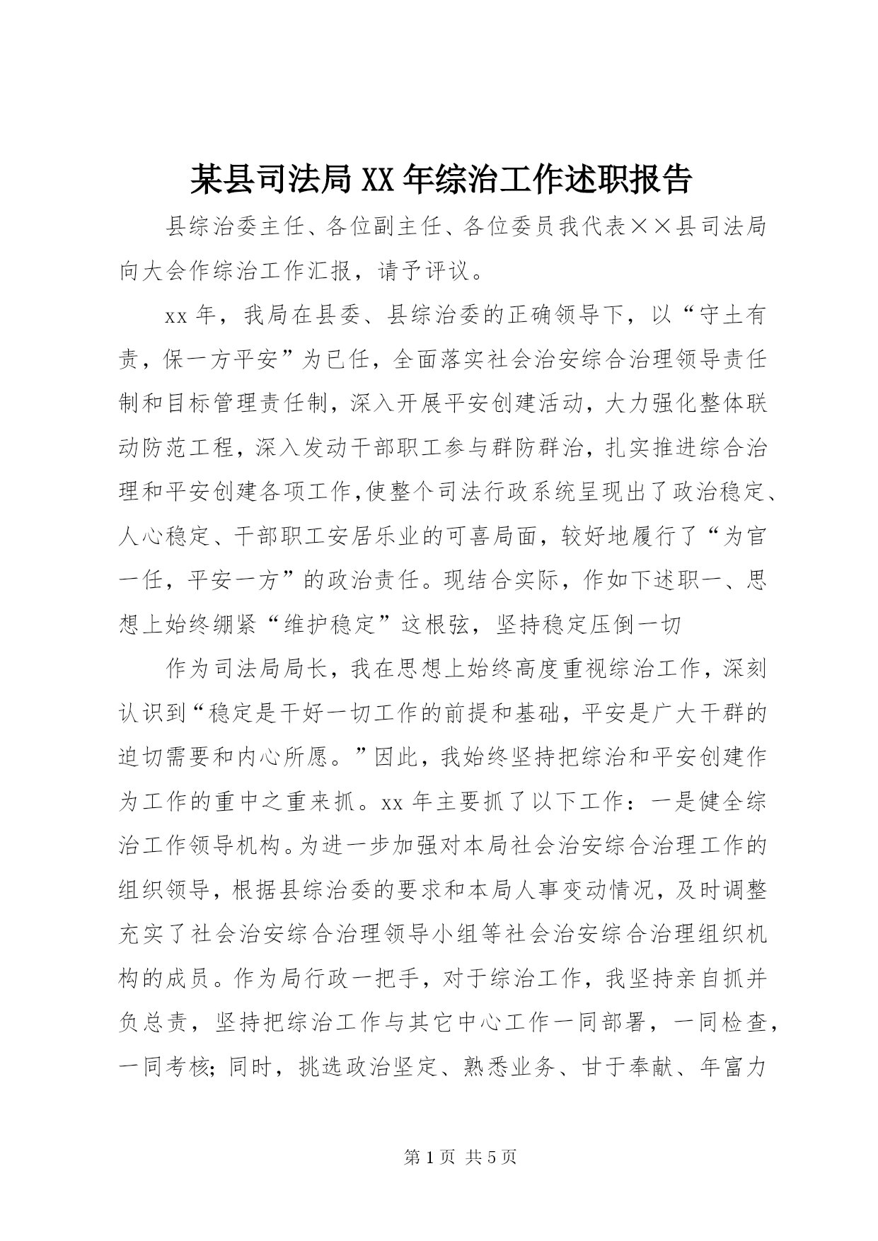 第PAGE\*Arabic\*MERGEFORMAT5页共NUMPAGES\*MERGEFORMAT5页某县司法局XX年综治工作述职报告县综治委主任、各位副主任、各位委员我代表××县司法局向大会作综治工作汇报,请予评议。xx年,我局在县委、县综治委的正确领导下,以“守土有责,保一方平安”为已任,全面落实社会治安综合治理领导责任制和目标管理责任制,深入开展平安创建活动,大力强化整体联动防范工程,深入发动干部职工参与群防群治,扎实推进综合治理和平安创建各项工作,使整个司法行政系统呈现出了政治稳定、