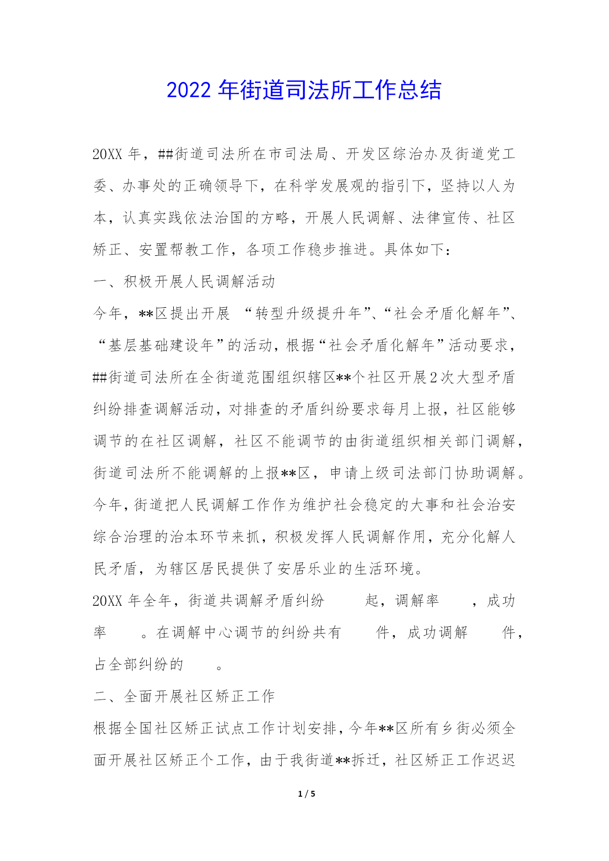 PAGE5/NUMPAGES52022年街道司法所工作总结20XX年,##街道司法所在市司法局、开发区综治办及街道党工委、办事处的正确领导下,在科学发展观的指引下,坚持以人为本,认真实践依法治国的方略,开展人民调解、法律宣传、社区矫正、安置帮教工作,各项工作稳步推进。具体如下:一、积极开展人民调解活动今年,**区提出开展“转型升级提升年”、“社会矛盾化解年”、“基层基础建设年”的活动,根据“社会矛盾化解年”活动要求,##街道司法所在全街道范围组织辖区**个社区开展2次大型矛盾纠纷排查调解活动,