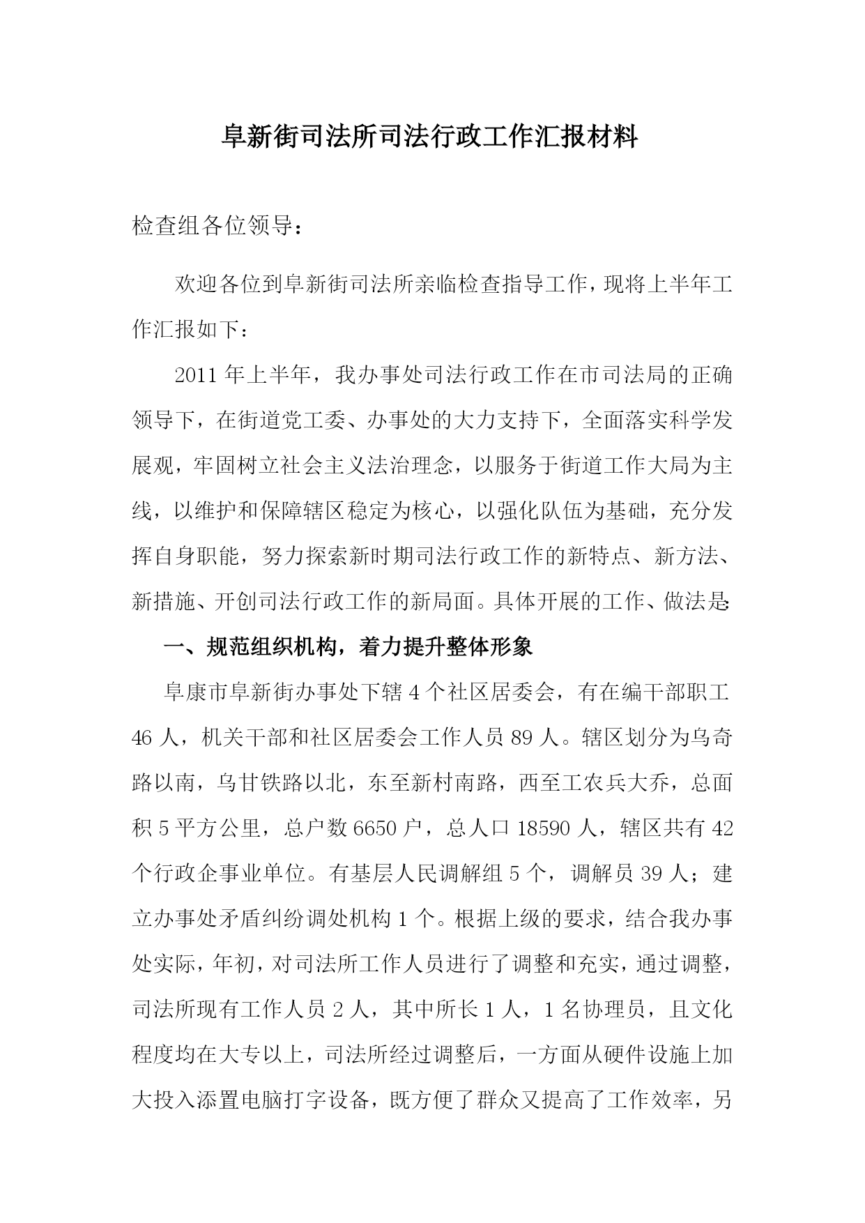 阜新街司法所司法行政工作汇报材料检查组各位领导:欢迎各位到阜新街司法所亲临检查指导工作,现将上半年工作汇报如下:2011年上半年,我办事处司法行政工作在市司法局的正确领导下,在街道党工委、办事处的大力支持下,全面落实科学发展观,牢固树立社会主义法治理念,以服务于街道工作大局为主线,以维护和保障辖区稳定为核心,以强化队伍为基础,充分发挥自身职能,努力探索新时期司法行政工作的新特点、新方法、新措施、开创司法行政工作的新局面。具体开展的工作、做法是:一、规范组织机构,着力提升整体形象阜康市阜新街办事处下辖4个社