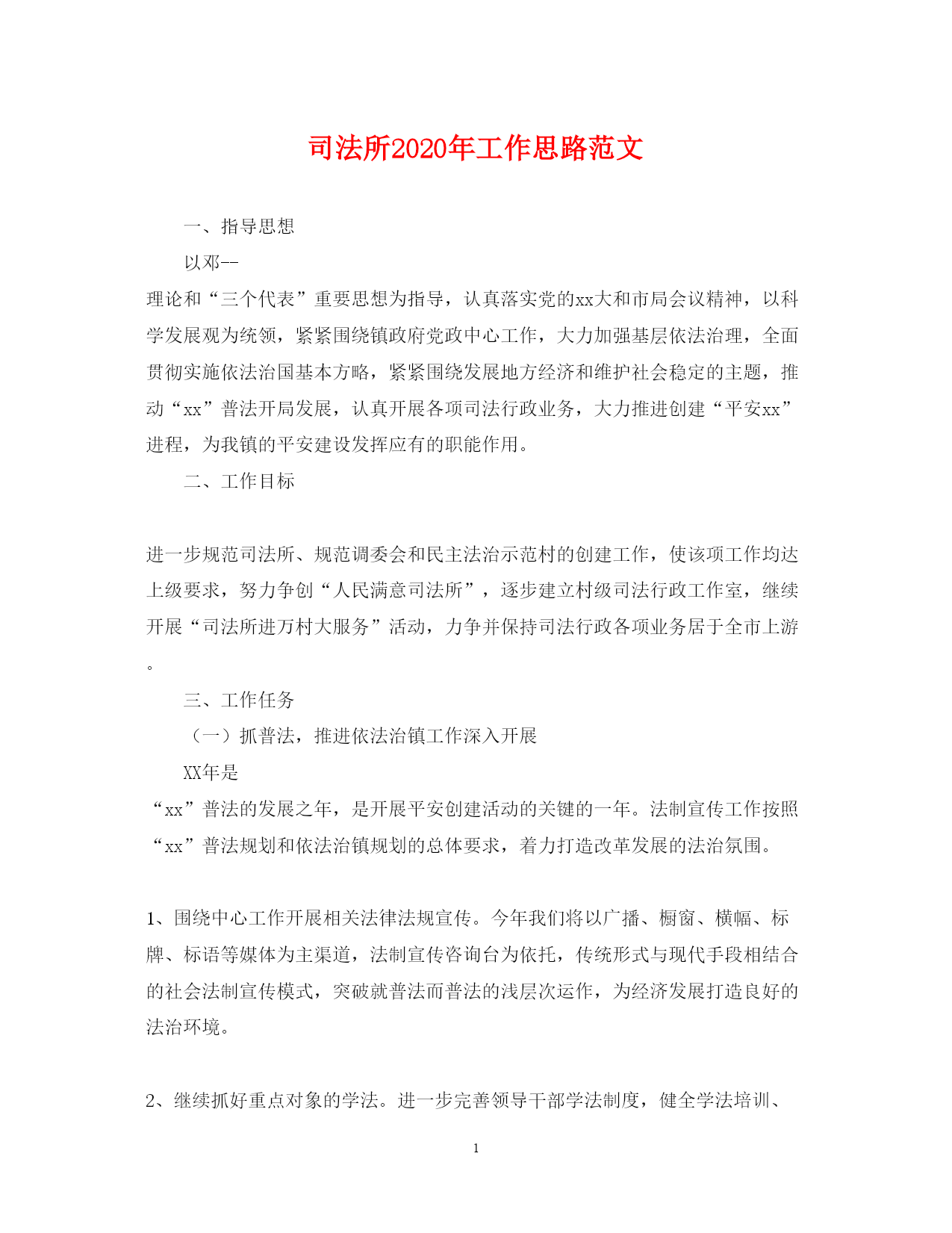 此资料由网络收集而来,如有侵权请告知上传者立即删除。资料共分享,我们负责传递知识。PAGEPAGE3司法所2020年工作思路范文一、指导思想以邓--理论和“三个代表”重要思想为指导,认真落实党的xx大和市局会议精神,以科学发展观为统领,紧紧围绕镇政府党政中心工作,大力加强基层依法治理,全面贯彻实施依法治国基本方略,紧紧围绕发展地方经济和维护社会稳定的主题,推动“xx”普法开局发展,认真开展各项司法行政业务,大力推进创建“平安xx”进程,为我镇的平安建设发挥应有的职能作用。二、工作目标进一步规范