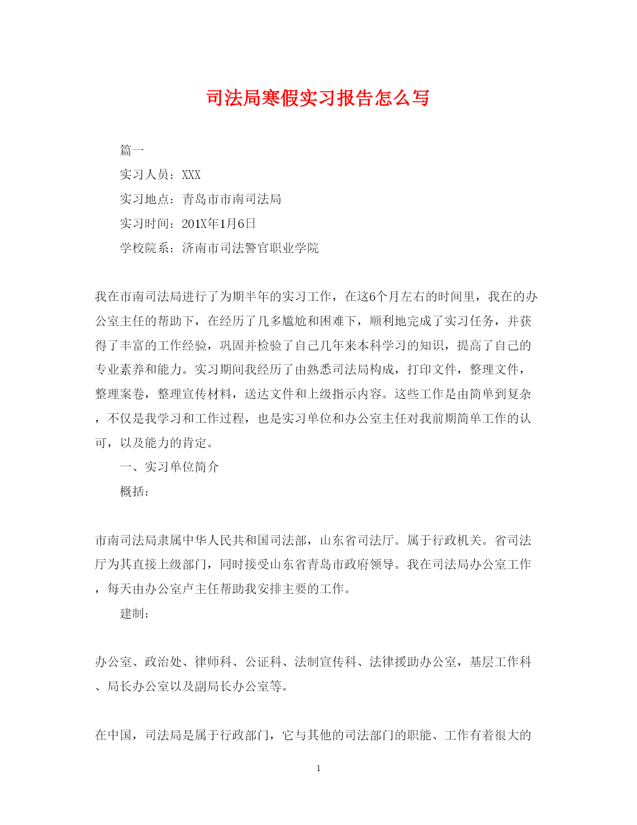 此资料由网络收集而来,如有侵权请告知上传者立即删除。资料共分享,我们负责传递知识。PAGEPAGE4司法局寒假实习报告怎么写篇一实习人员:XXX实习地点:青岛市市南司法局实习时间:201X年1月6日学校院系:济南市司法警官职业学院我在市南司法局进行了为期半年的实习工作,在这6个月左右的时间里,我在的办公室主任的帮助下,在经历了几多尴尬和困难下,顺利地完成了实习任务,并获得了丰富的工作经验,巩固并检验了自己几年来本科学习的知识,提高了自己的专业素养和能力。实习期间我经历了由熟悉司法局构成,打印文