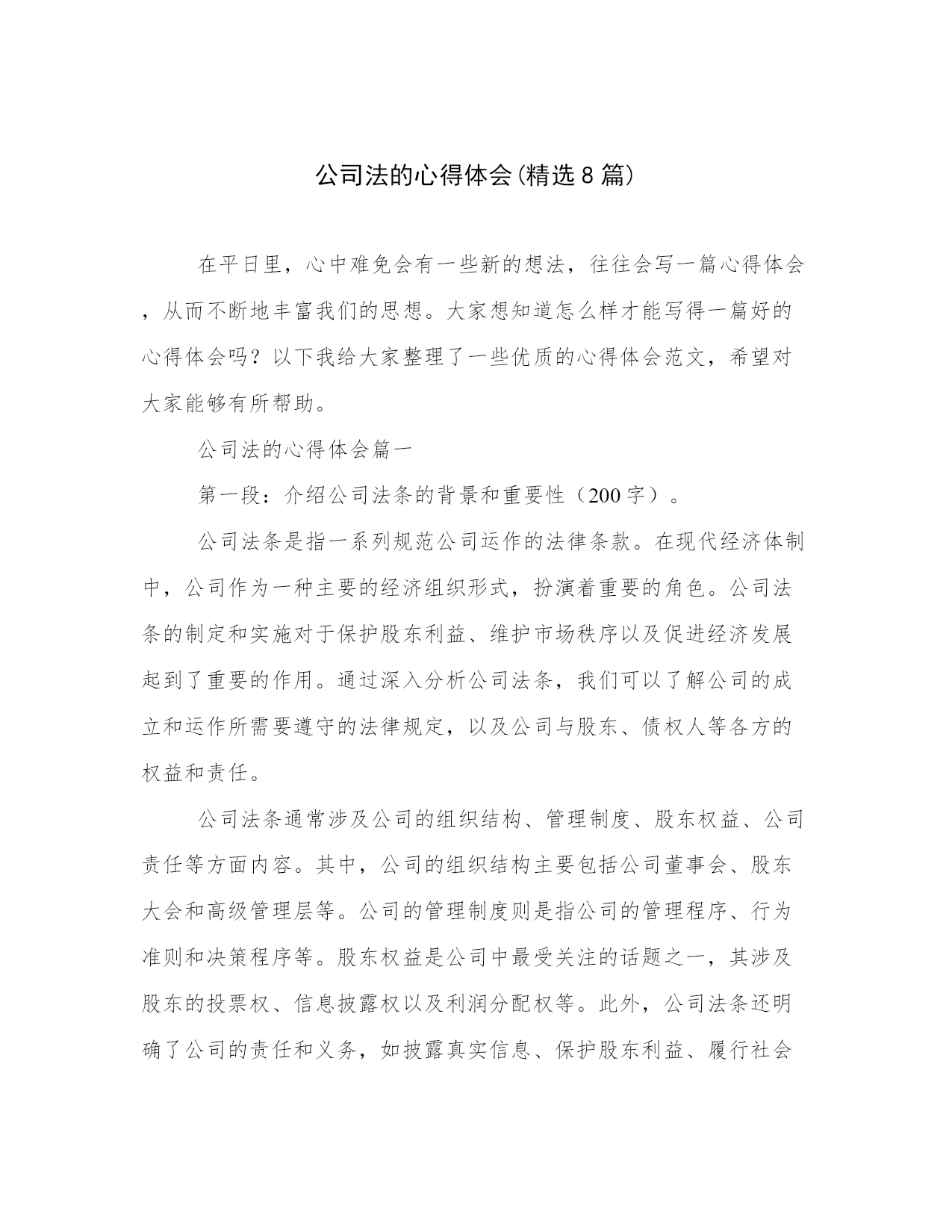 公司法的心得体会(精选8篇)在平日里,心中难免会有一些新的想法,往往会写一篇心得体会,从而不断地丰富我们的思想。大家想知道怎么样才能写得一篇好的心得体会吗?以下我给大家整理了一些优质的心得体会范文,希望对大家能够有所帮助。公司法的心得体会篇一第一段:介绍公司法条的背景和重要性(200字)。公司法条是指一系列规范公司运作的法律条款。在现代经济体制中,公司作为一种主要的经济组织形式,扮演着重要的角色。公司法条的制定和实施对于保护股东利益、维护市场秩序以及促进经济发展起到了重要的作用。通过深入分析公司法条,我们