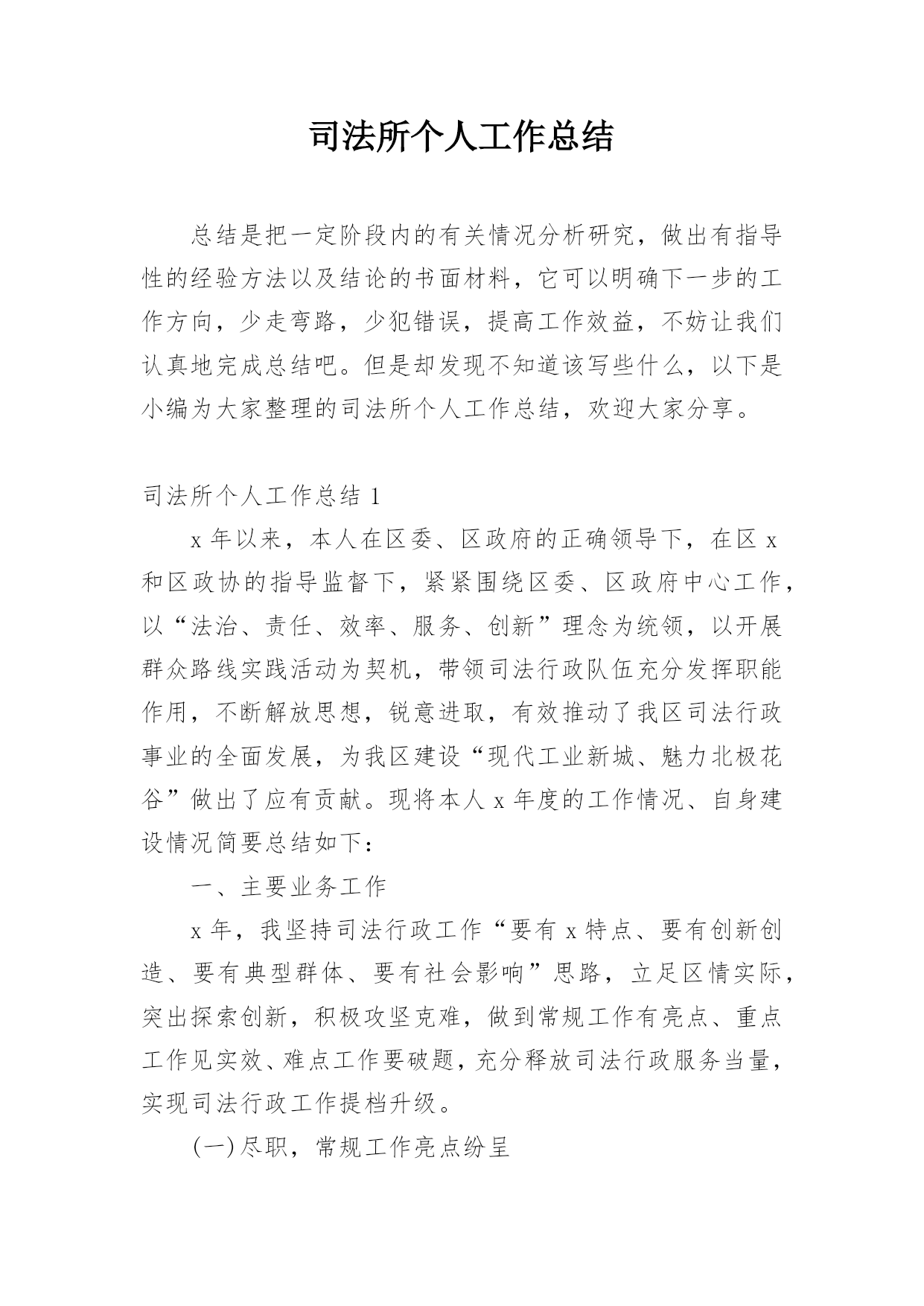 司法所个人工作总结总结是把一定阶段内的有关情况分析研究,做出有指导性的经验方法以及结论的书面材料,它可以明确下一步的工作方向,少走弯路,少犯错误,提高工作效益,不妨让我们认真地完成总结吧。但是却发现不知道该写些什么,以下是小编为大家整理的司法所个人工作总结,欢迎大家分享。司法所个人工作总结1x年以来,本人在区委、区政府的正确领导下,在区x和区政协的指导监督下,紧紧围绕区委、区政府中心工作,以“法治、责任、效率、服务、创新”理念为统领,以开展群众路线实践活动为契机,带领司法行政队伍充分发挥职能作用,不断解放