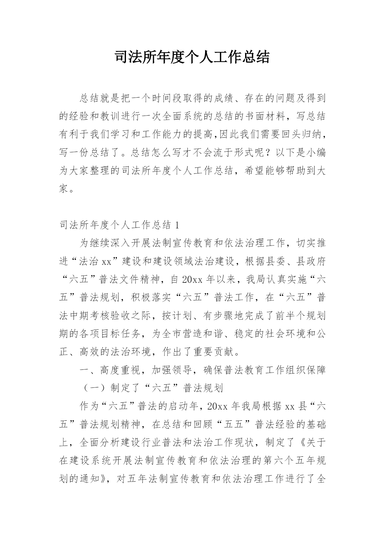 司法所年度个人工作总结总结就是把一个时间段取得的成绩、存在的问题及得到的经验和教训进行一次全面系统的总结的书面材料,写总结有利于我们学习和工作能力的提高,因此我们需要回头归纳,写一份总结了。总结怎么写才不会流于形式呢?以下是小编为大家整理的司法所年度个人工作总结,希望能够帮助到大家。司法所年度个人工作总结1为继续深入开展法制宣传教育和依法治理工作,切实推进“法治xx”建设和建设领域法治建设,根据县委、县政府“六五”普法文件精神,自20xx年以来,我局认真实施“六五”普法规划,积极落实“六五”普法工作,在“
