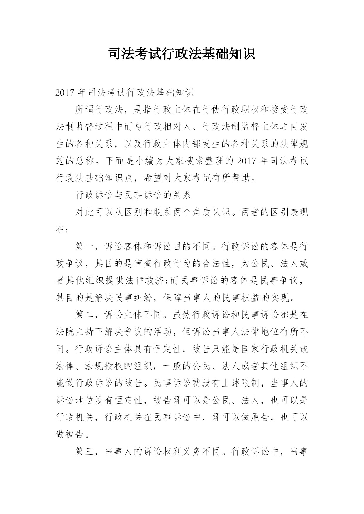 司法考试行政法基础知识2017年司法考试行政法基础知识所谓行政法,是指行政主体在行使行政职权和接受行政法制监督过程中而与行政相对人、行政法制监督主体之间发生的各种关系,以及行政主体内部发生的各种关系的法律规范的总称。下面是小编为大家搜索整理的2017年司法考试行政法基础知识点,希望对大家考试有所帮助。行政诉讼与民事诉讼的关系对此可以从区别和联系两个角度认识。两者的区别表现在:第一,诉讼客体和诉讼目的不同。行政诉讼的客体是行政争议,其目的是审查行政行为的合法性,为公民、法人或者其他组织提供法律救济;而民事诉