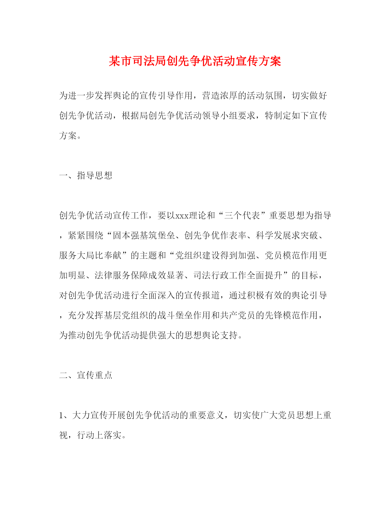 PAGE此资料由网络收集而来,如有侵权请告知上传者立即删除。资料共分享,我们负责传递知识。某市司法局创先争优活动宣传方案为进一步发挥舆论的宣传引导作用,营造浓厚的活动氛围,切实做好创先争优活动,根据局创先争优活动领导小组要求,特制定如下宣传方案。一、指导思想创先争优活动宣传工作,要以xxx理论和“三个代表”重要思想为指导,紧紧围绕“固本强基筑堡垒、创先争优作表率、科学发展求突破、服务大局比奉献”的主题和“党组织建设得到加强、党员模范作用更加明显、法律服务保障成效显著、司法行政工作全面提升”的目标,对