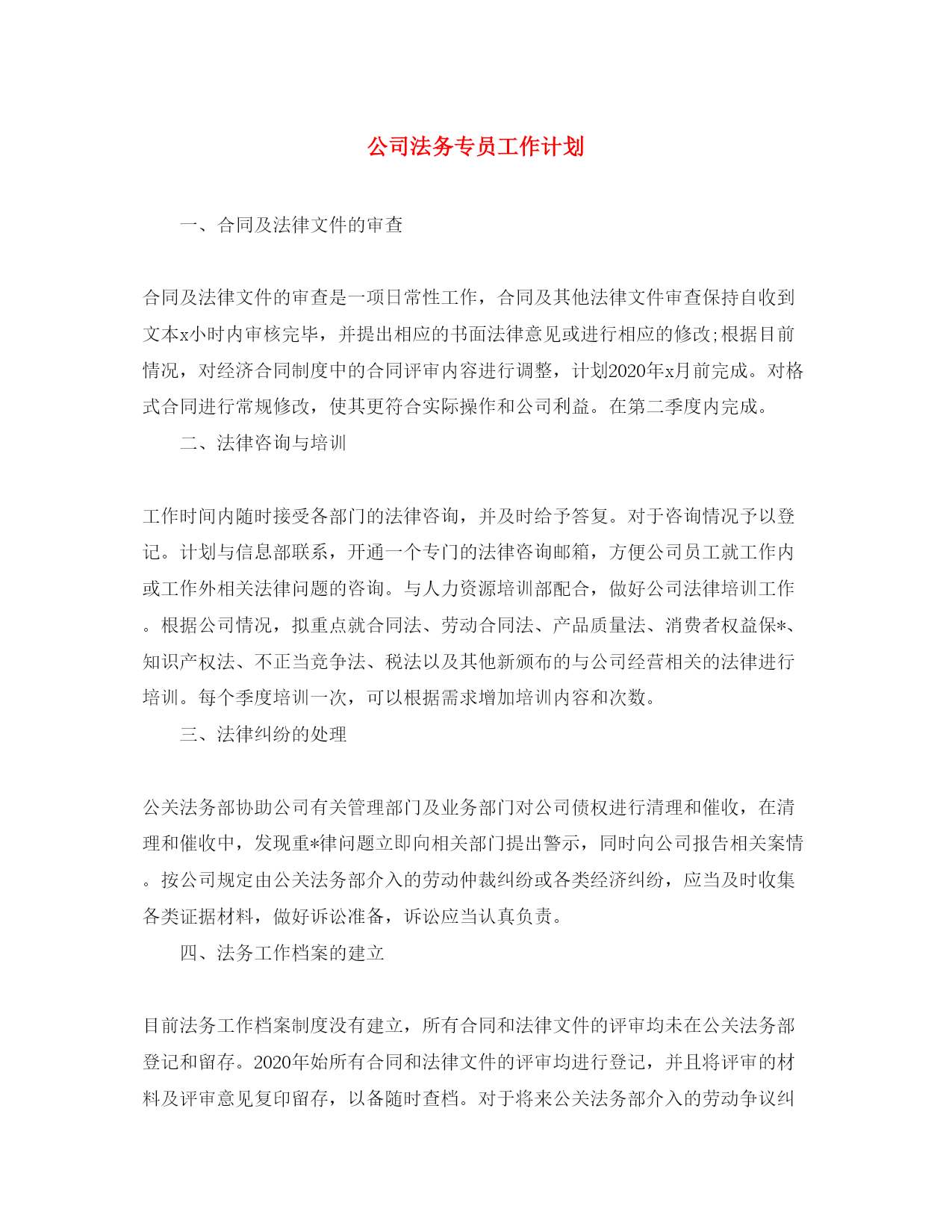 此资料由网络收集而来,如有侵权请告知上传者立即删除。资料共分享,我们负责传递知识。公司法务专员工作计划一、合同及法律文件的审查合同及法律文件的审查是一项日常性工作,合同及其他法律文件审查保持自收到文本x小时内审核完毕,并提出相应的书面法律意见或进行相应的修改;根据目前情况,对经济合同制度中的合同评审内容进行调整,计划2020年x月前完成。对格式合同进行常规修改,使其更符合实际操作和公司利益。在第二季度内完成。二、法律咨询与培训工作时间内随时接受各部门的法律咨询,并及时给予答复。对于咨询情况予以登记。计划与