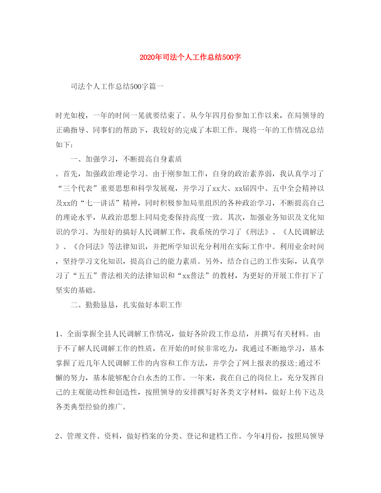 此资料由网络收集而来,如有侵权请告知上传者立即删除。资料共分享,我们负责传递知识。2020年司法个人工作总结500字司法个人工作总结500字篇一时光如梭,一年的时间一晃就要结束了。从今年四月份参加工作以来,在局领导的正确指导、同事们的帮助下,我较好的完成了本职工作。现将一年的工作情况总结如下:一、加强学习,不断提高自身素质。首先,加强政治理论学习。由于刚参加工作,自身的政治素养弱,我认真学习了“三个代表”重要思想和科学发展观,并学习了xx大、xx届四中、五中全会精神以及xx的“七一讲话”精神,同时积极参加