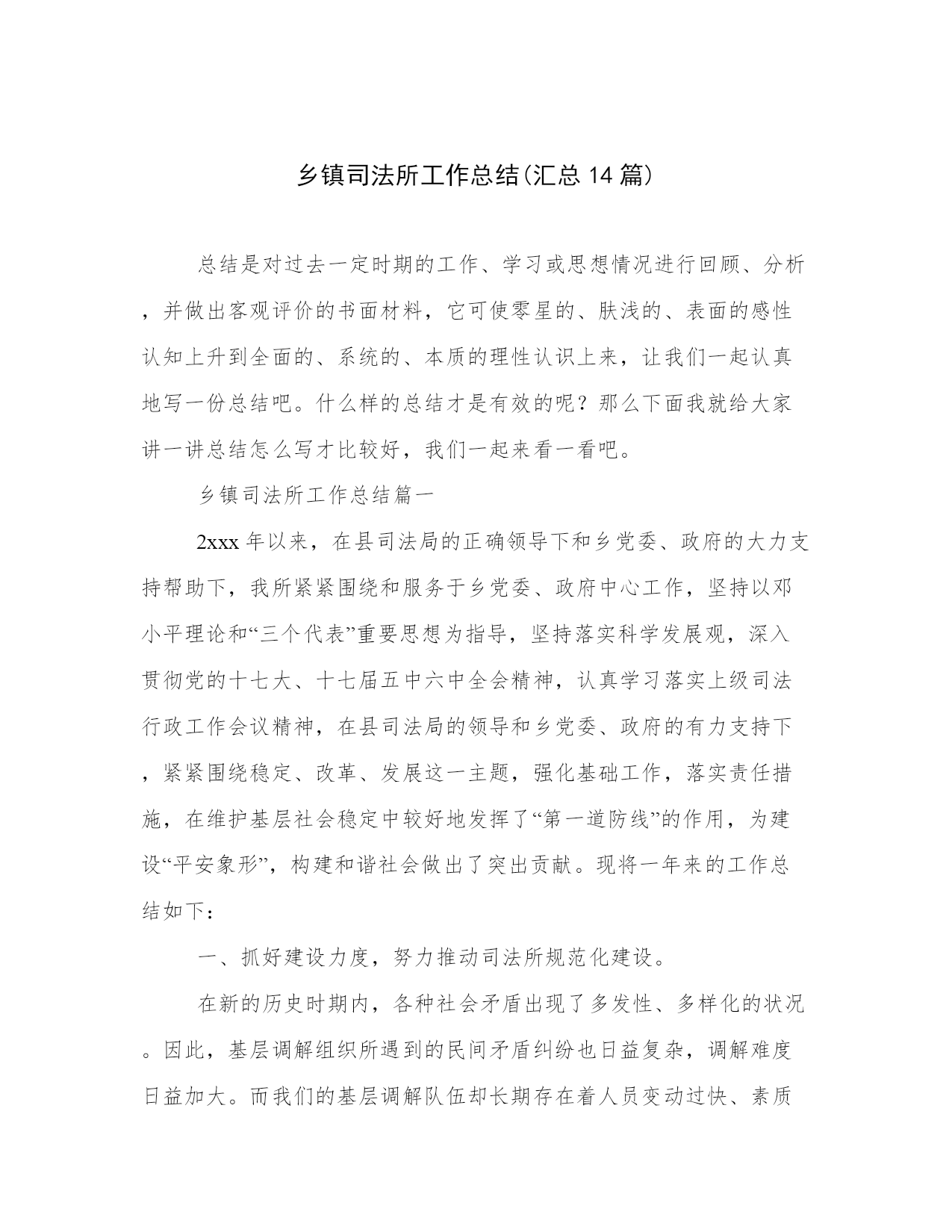 乡镇司法所工作总结(汇总14篇)总结是对过去一定时期的工作、学习或思想情况进行回顾、分析,并做出客观评价的书面材料,它可使零星的、肤浅的、表面的感性认知上升到全面的、系统的、本质的理性认识上来,让我们一起认真地写一份总结吧。什么样的总结才是有效的呢?那么下面我就给大家讲一讲总结怎么写才比较好,我们一起来看一看吧。乡镇司法所工作总结篇一2xxx年以来,在县司法局的正确领导下和乡党委、政府的大力支持帮助下,我所紧紧围绕和服务于乡党委、政府中心工作,坚持以邓小平理论和“三个代表”重要思想为指导,坚持落实科学发展