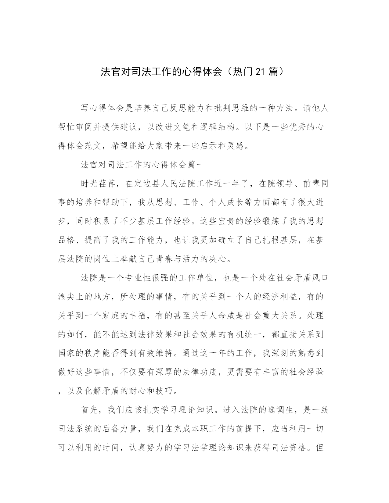 法官对司法工作的心得体会(热门21篇)写心得体会是培养自己反思能力和批判思维的一种方法。请他人帮忙审阅并提供建议,以改进文笔和逻辑结构。以下是一些优秀的心得体会范文,希望能给大家带来一些启示和灵感。法官对司法工作的心得体会篇一时光荏苒,在定边县人民法院工作近一年了,在院领导、前辈同事的培养和帮助下,我从思想、工作、个人成长等方面都有了很大进步,同时积累了不少基层工作经验。这些宝贵的经验锻炼了我的思想品格、提高了我的工作能力,也让我更加确立了自己扎根基层,在基层法院的岗位上奉献自己青春与活力的决心。法院是一