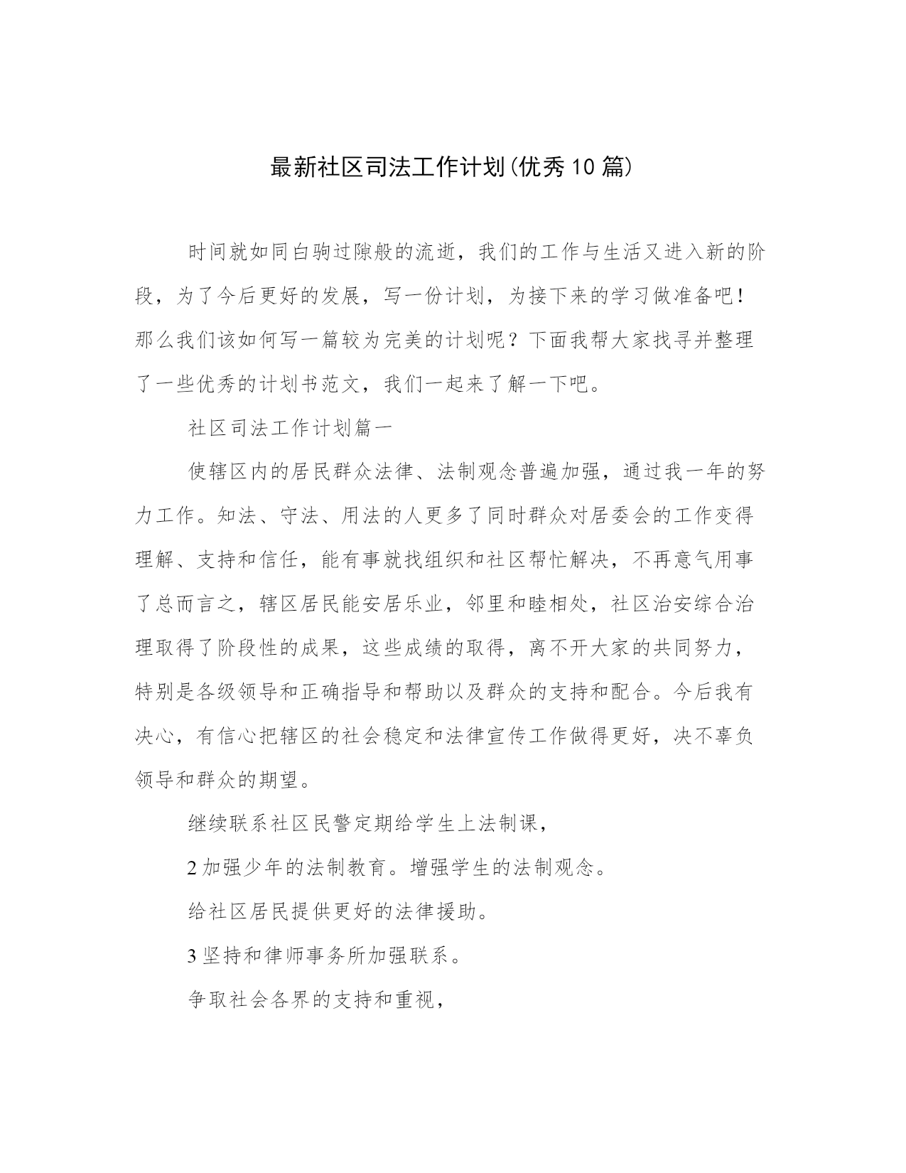最新社区司法工作计划(优秀10篇)时间就如同白驹过隙般的流逝,我们的工作与生活又进入新的阶段,为了今后更好的发展,写一份计划,为接下来的学习做准备吧!那么我们该如何写一篇较为完美的计划呢?下面我帮大家找寻并整理了一些优秀的计划书范文,我们一起来了解一下吧。社区司法工作计划篇一使辖区内的居民群众法律、法制观念普遍加强,通过我一年的努力工作。知法、守法、用法的人更多了同时群众对居委会的工作变得理解、支持和信任,能有事就找组织和社区帮忙解决,不再意气用事了总而言之,辖区居民能安居乐业,邻里和睦相处,社区治安综合
