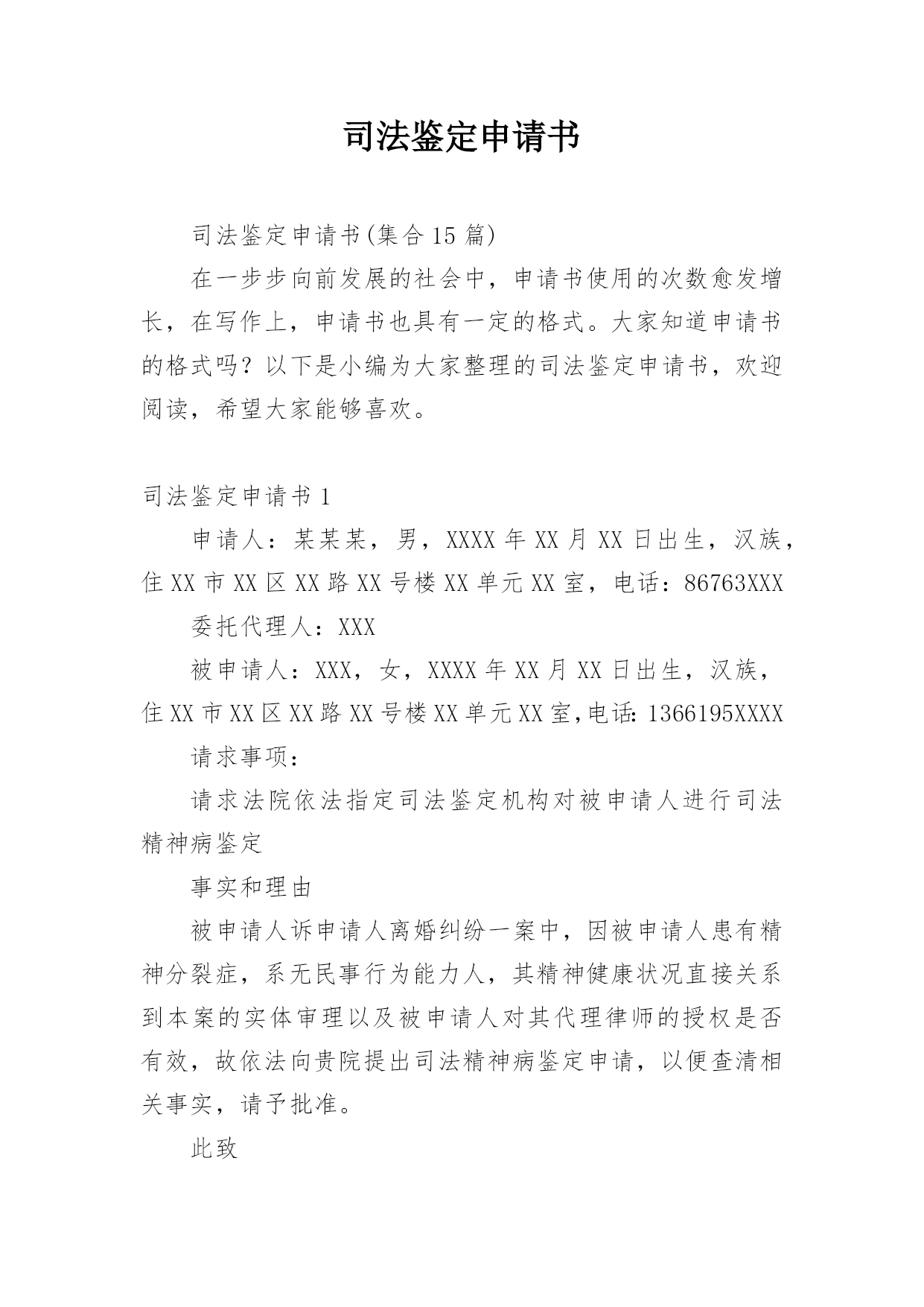 司法鉴定申请书司法鉴定申请书(集合15篇)在一步步向前发展的社会中,申请书使用的次数愈发增长,在写作上,申请书也具有一定的格式。大家知道申请书的格式吗?以下是小编为大家整理的司法鉴定申请书,欢迎阅读,希望大家能够喜欢。司法鉴定申请书1申请人:某某某,男,XXXX年XX月XX日出生,汉族,住XX市XX区XX路XX号楼XX单元XX室,电话:86763XXX委托代理人:XXX被申请人:XXX,女,XXXX年XX月XX日出生,汉族,住XX市XX区XX路XX号楼XX单元XX室,电话:1366195XXXX请求事项: