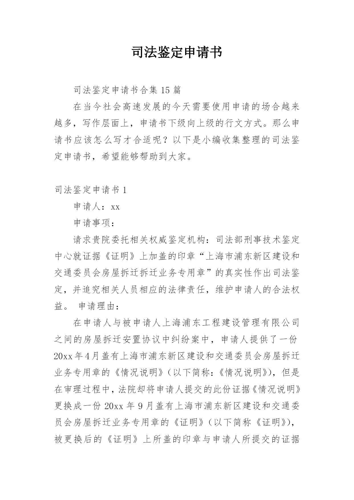 司法鉴定申请书司法鉴定申请书合集15篇在当今社会高速发展的今天需要使用申请的场合越来越多,写作层面上,申请书下级向上级的行文方式。那么申请书应该怎么写才合适呢?以下是小编收集整理的司法鉴定申请书,希望能够帮助到大家。司法鉴定申请书1申请人:xx申请事项:请求贵院委托相关权威鉴定机构:司法部刑事技术鉴定中心就证据《证明》上加盖的印章“上海市浦东新区建设和交通委员会房屋拆迁拆迁业务专用章”的真实性作出司法鉴定,并追究相关人员相应的法律责任,维护申请人的合法权益。申请理由:在申请人与被申请人上海浦东工程建设管理