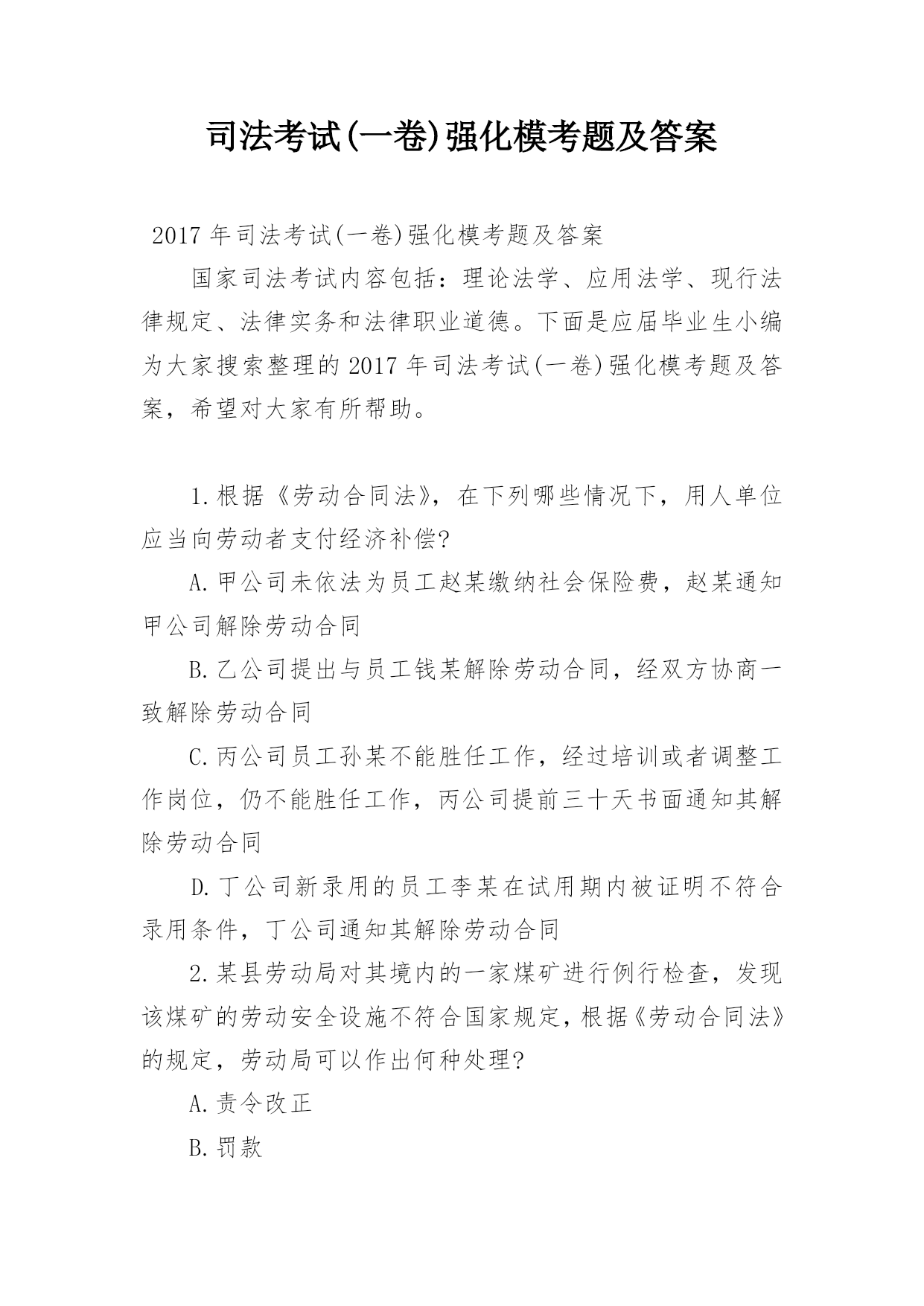司法考试(一卷)强化模考题及答案2017年司法考试(一卷)强化模考题及答案国家司法考试内容包括:理论法学、应用法学、现行法律规定、法律实务和法律职业道德。下面是应届毕业生小编为大家搜索整理的2017年司法考试(一卷)强化模考题及答案,希望对大家有所帮助。1.根据《劳动合同法》,在下列哪些情况下,用人单位应当向劳动者支付经济补偿?A.甲公司未依法为员工赵某缴纳社会保险费,赵某通知甲公司解除劳动合同B.乙公司提出与员工钱某解除劳动合同,经双方协商一致解除劳动合同C.丙公司员工孙某不能胜任工作,经过培训或者调整