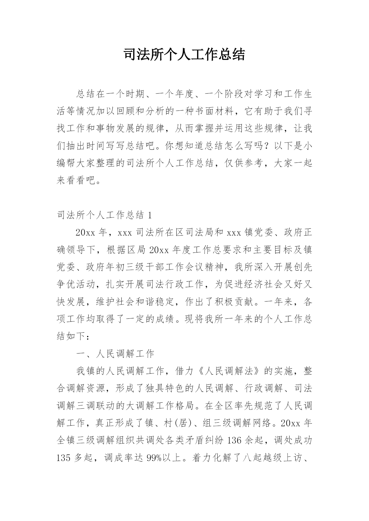 司法所个人工作总结总结在一个时期、一个年度、一个阶段对学习和工作生活等情况加以回顾和分析的一种书面材料,它有助于我们寻找工作和事物发展的规律,从而掌握并运用这些规律,让我们抽出时间写写总结吧。你想知道总结怎么写吗?以下是小编帮大家整理的司法所个人工作总结,仅供参考,大家一起来看看吧。司法所个人工作总结120xx年,xxx司法所在区司法局和xxx镇党委、政府正确领导下,根据区局20xx年度工作总要求和主要目标及镇党委、政府年初三级干部工作会议精神,我所深入开展创先争优活动,扎实开展司法行政工作,为促进经济社