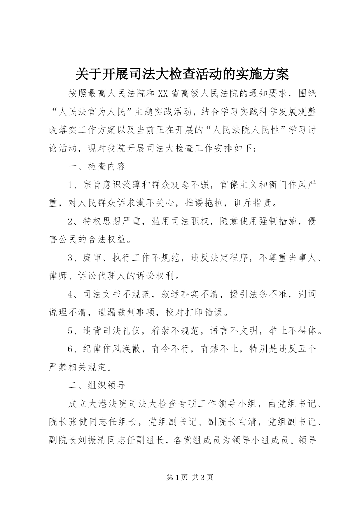 第PAGE\*Arabic\*MERGEFORMAT3页共NUMPAGES\*MERGEFORMAT3页关于开展司法大检查活动的实施方案按照最高人民法院和XX省高级人民法院的通知要求,围绕“人民法官为人民”主题实践活动,结合学习实践科学发展观整改落实工作方案以及当前正在开展的“人民法院人民性”学习讨论活动,现对我院开展司法大检查工作安排如下:一、检查内容1、宗旨意识淡薄和群众观念不强,官僚主义和衙门作风严重,对人民群众诉求漠不关心,推诿拖拉,训斥指责。2、特权思想严重,滥用司法职权,随意使用强