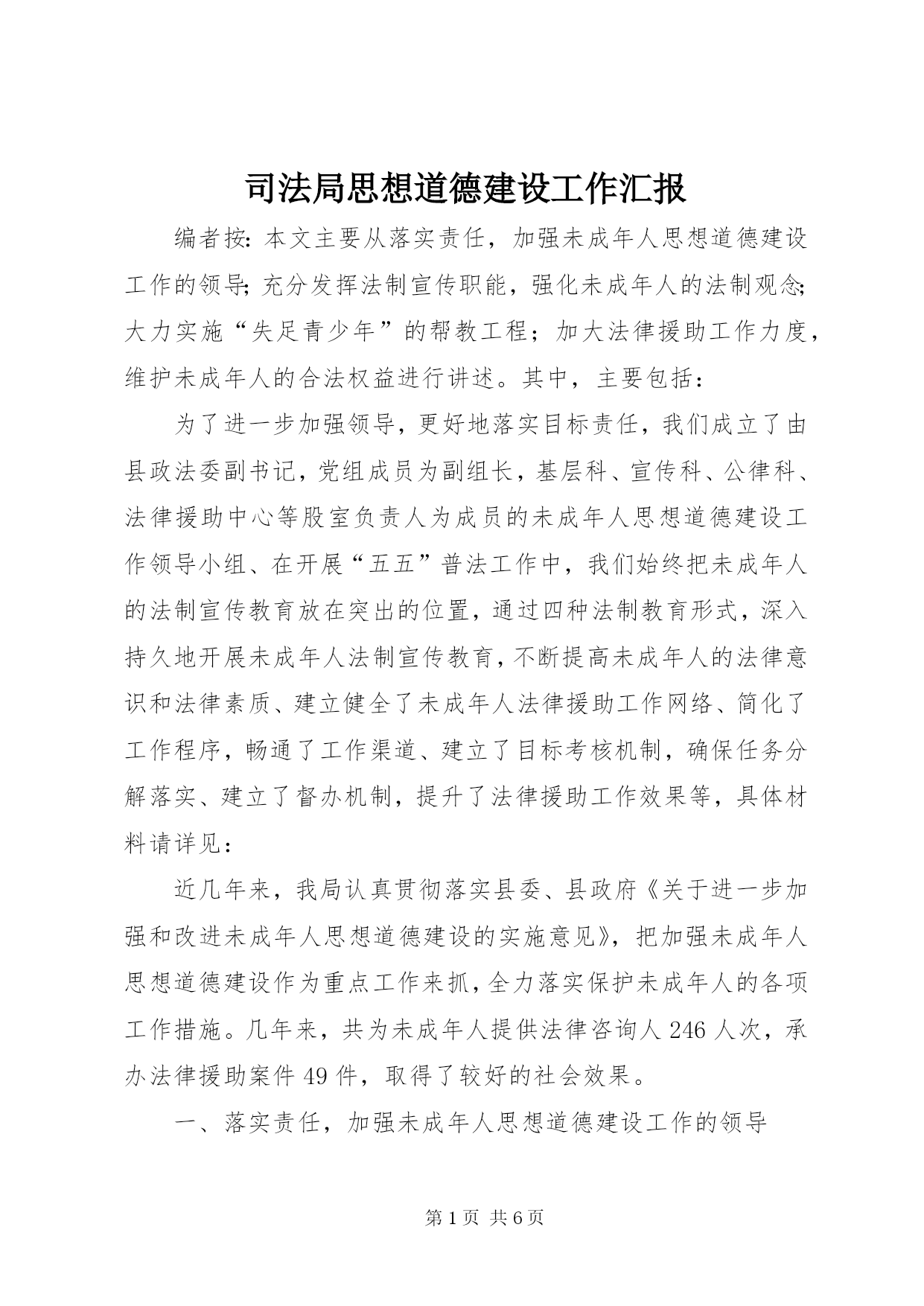第PAGE\*Arabic\*MERGEFORMAT6页共NUMPAGES\*MERGEFORMAT6页司法局思想道德建设工作汇报编者按:本文主要从落实责任,加强未成年人思想道德建设工作的领导;充分发挥法制宣传职能,强化未成年人的法制观念;大力实施“失足青少年”的帮教工程;加大法律援助工作力度,维护未成年人的合法权益进行讲述。其中,主要包括:为了进一步加强领导,更好地落实目标责任,我们成立了由县政法委副书记,党组成员为副组长,基层科、宣传科、公律科、法律援助中心等股室负责人为成员的未成年人思想