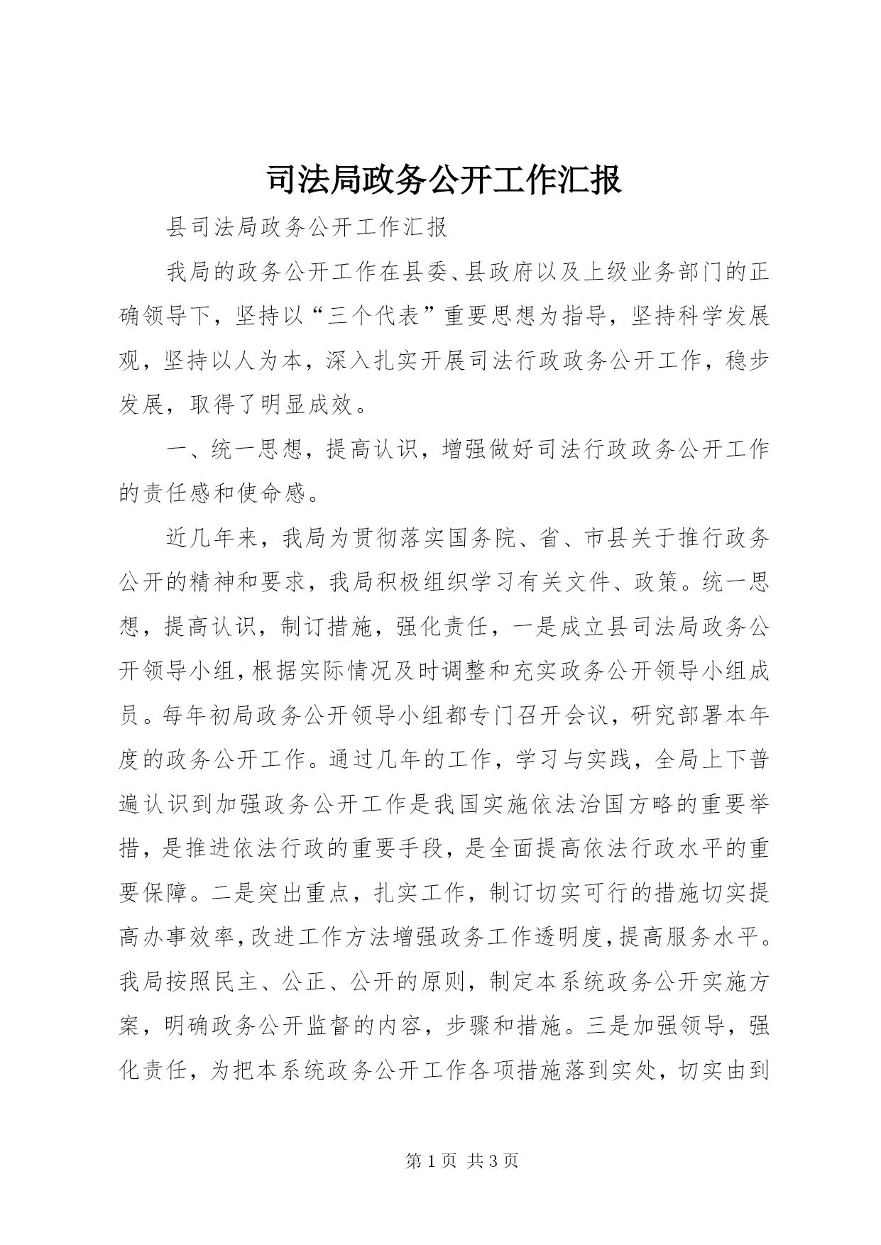 第PAGE\*Arabic\*MERGEFORMAT3页共NUMPAGES\*MERGEFORMAT3页司法局政务公开工作汇报县司法局政务公开工作汇报我局的政务公开工作在县委、县政府以及上级业务部门的正确领导下,坚持以“三个代表”重要思想为指导,坚持科学发展观,坚持以人为本,深入扎实开展司法行政政务公开工作,稳步发展,取得了明显成效。一、统一思想,提高认识,增强做好司法行政政务公开工作的责任感和使命感。近几年来,我局为贯彻落实国务院、省、市县关于推行政务公开的精神和要求,我局积极组织学习有关文