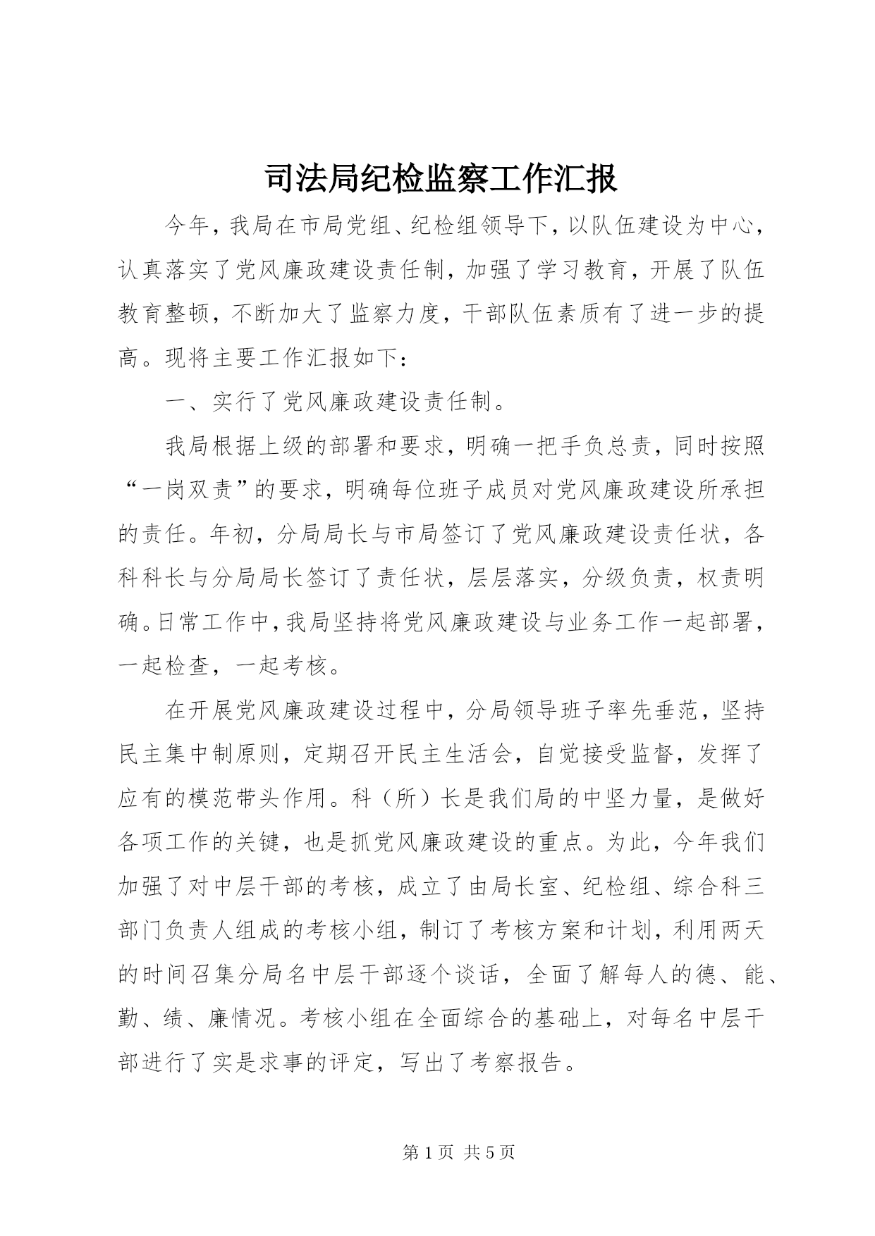 第PAGE\*Arabic\*MERGEFORMAT5页共NUMPAGES\*MERGEFORMAT5页司法局纪检监察工作汇报今年,我局在市局党组、纪检组领导下,以队伍建设为中心,认真落实了党风廉政建设责任制,加强了学习教育,开展了队伍教育整顿,不断加大了监察力度,干部队伍素质有了进一步的提高。现将主要工作汇报如下:一、实行了党风廉政建设责任制。我局根据上级的部署和要求,明确一把手负总责,同时按照“一岗双责”的要求,明确每位班子成员对党风廉政建设所承担的责任。年初,分局局长与市局签订了党风廉政