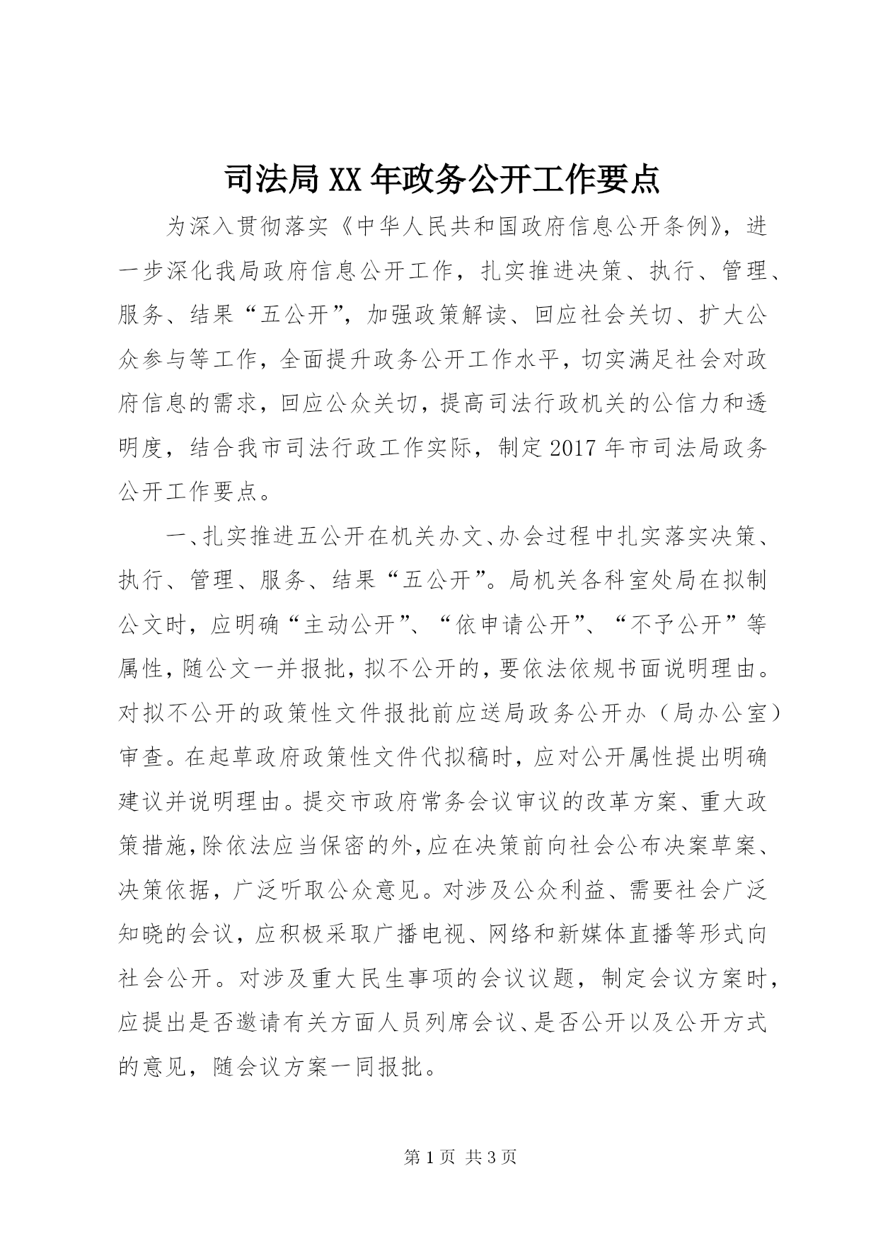 第PAGE\*Arabic\*MERGEFORMAT3页共NUMPAGES\*MERGEFORMAT3页司法局XX年政务公开工作要点为深入贯彻落实《中华人民共和国政府信息公开条例》,进一步深化我局政府信息公开工作,扎实推进决策、执行、管理、服务、结果“五公开”,加强政策解读、回应社会关切、扩大公众参与等工作,全面提升政务公开工作水平,切实满足社会对政府信息的需求,回应公众关切,提高司法行政机关的公信力和透明度,结合我市司法行政工作实际,制定2017年市司法局政务公开工作要点。一、扎实推进五公开