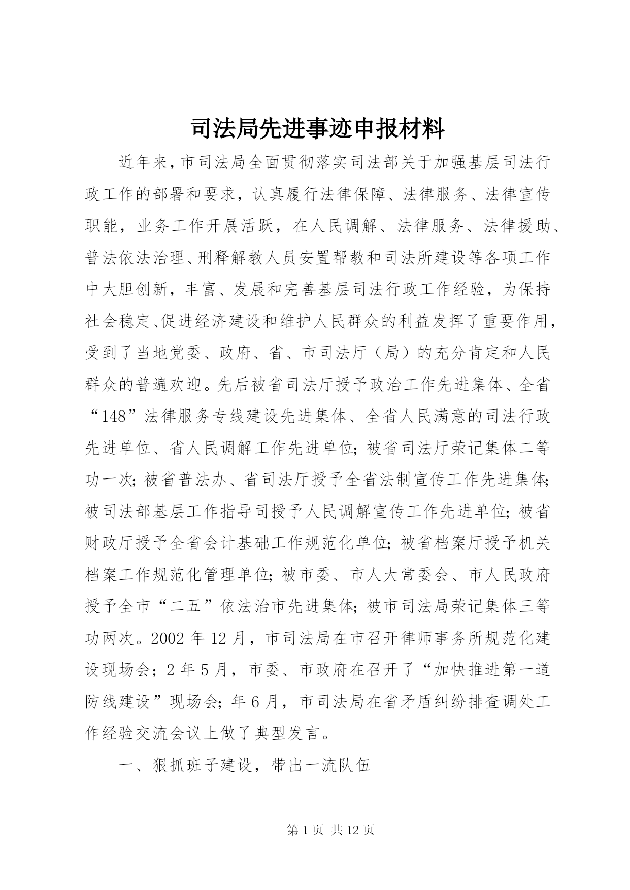 第PAGE\*Arabic\*MERGEFORMAT12页共NUMPAGES\*MERGEFORMAT12页司法局先进事迹申报材料近年来,市司法局全面贯彻落实司法部关于加强基层司法行政工作的部署和要求,认真履行法律保障、法律服务、法律宣传职能,业务工作开展活跃,在人民调解、法律服务、法律援助、普法依法治理、刑释解教人员安置帮教和司法所建设等各项工作中大胆创新,丰富、发展和完善基层司法行政工作经验,为保持社会稳定、促进经济建设和维护人民群众的利益发挥了重要作用,受到了当地党委、政府、省、市司法厅
