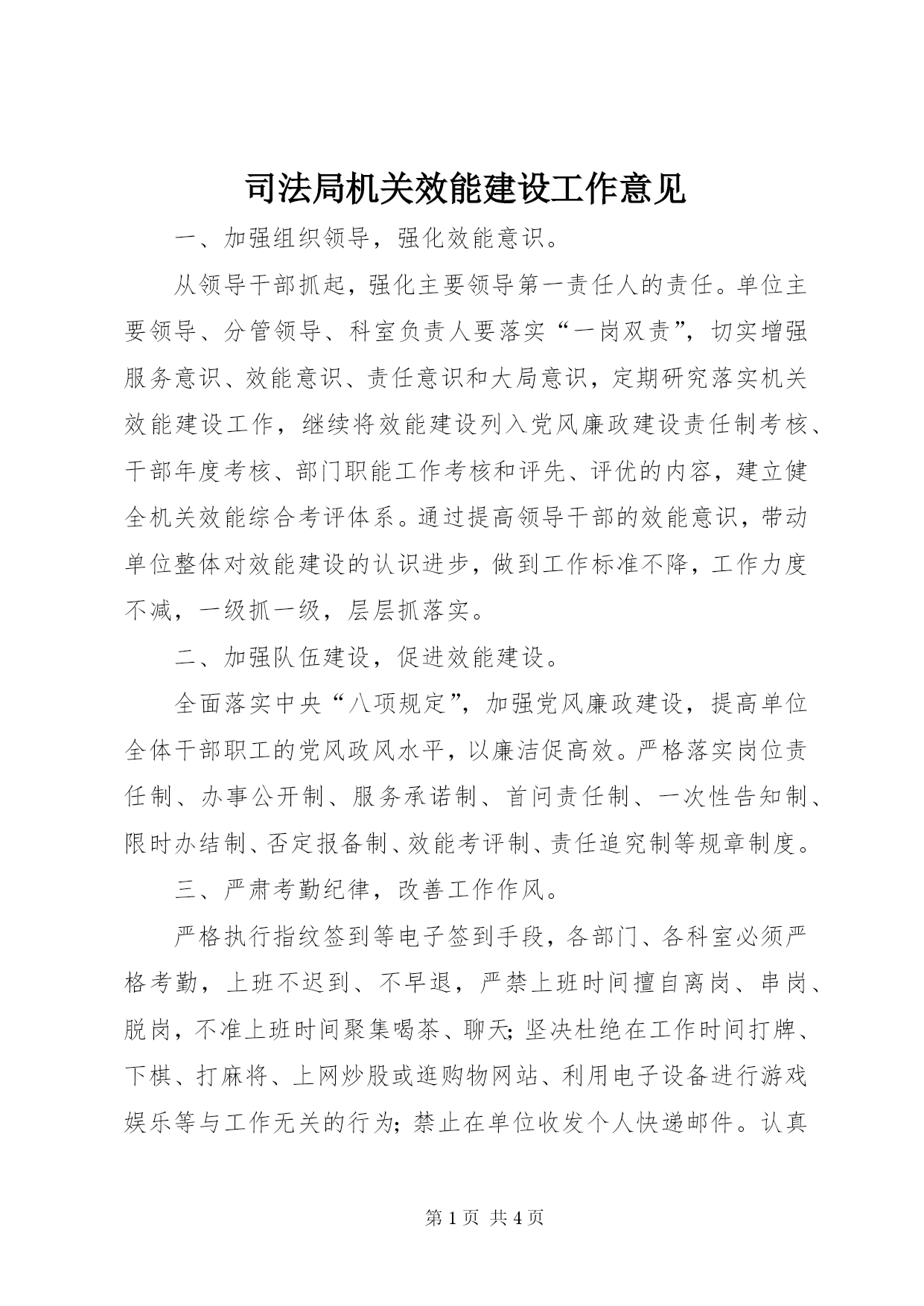 第PAGE\*Arabic\*MERGEFORMAT4页共NUMPAGES\*MERGEFORMAT4页司法局机关效能建设工作意见一、加强组织领导,强化效能意识。从领导干部抓起,强化主要领导第一责任人的责任。单位主要领导、分管领导、科室负责人要落实“一岗双责”,切实增强服务意识、效能意识、责任意识和大局意识,定期研究落实机关效能建设工作,继续将效能建设列入党风廉政建设责任制考核、干部年度考核、部门职能工作考核和评先、评优的内容,建立健全机关效能综合考评体系。通过提高领导干部的效能意识,带动单位