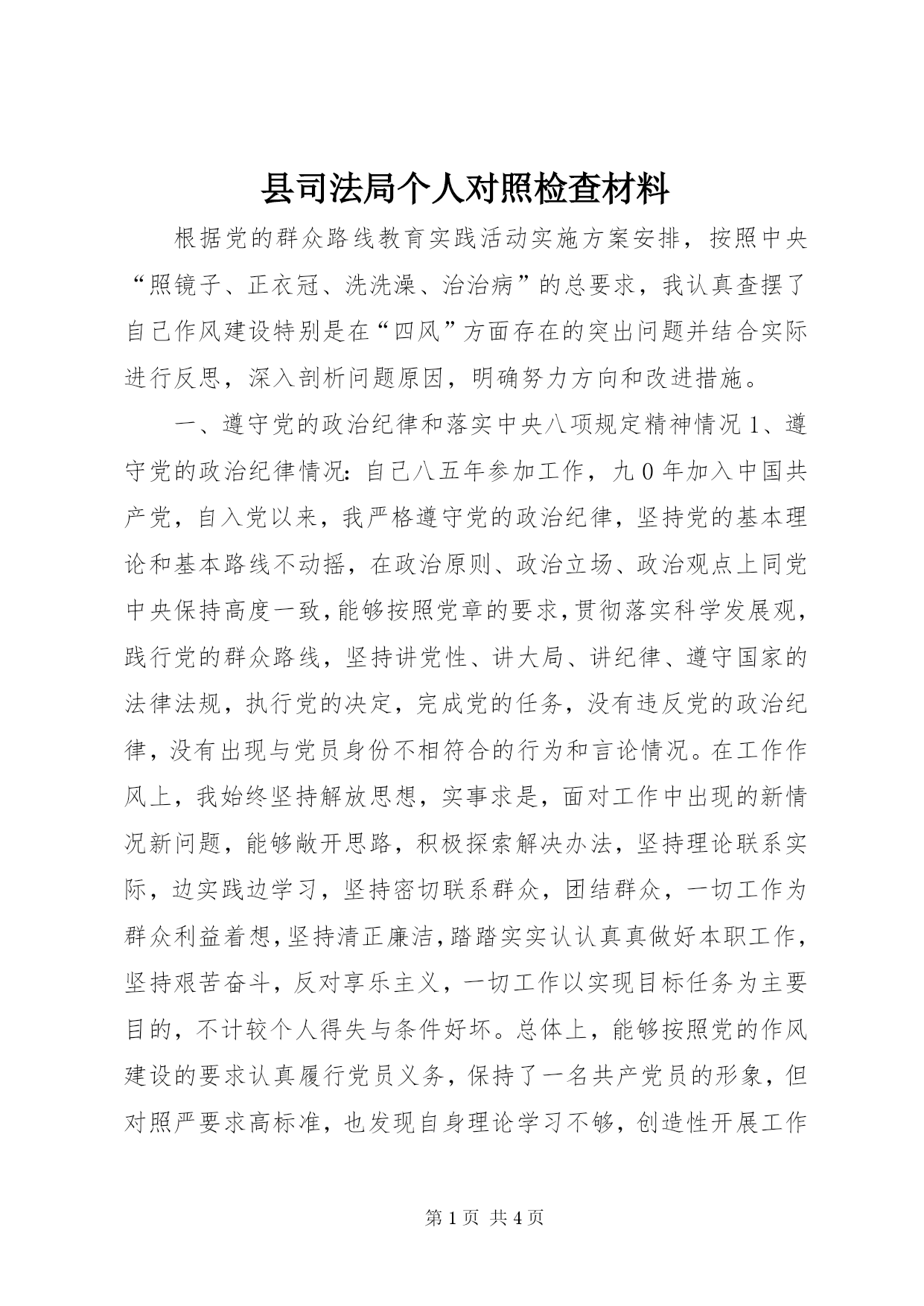 第PAGE\*Arabic\*MERGEFORMAT4页共NUMPAGES\*MERGEFORMAT4页县司法局个人对照检查材料根据党的群众路线教育实践活动实施方案安排,按照中央“照镜子、正衣冠、洗洗澡、治治病”的总要求,我认真查摆了自己作风建设特别是在“四风”方面存在的突出问题并结合实际进行反思,深入剖析问题原因,明确努力方向和改进措施。一、遵守党的政治纪律和落实中央八项规定精神情况1、遵守党的政治纪律情况:自己八五年参加工作,九0年加入中国共产党,自入党以来,我严格遵守党的政治纪律,坚持党
