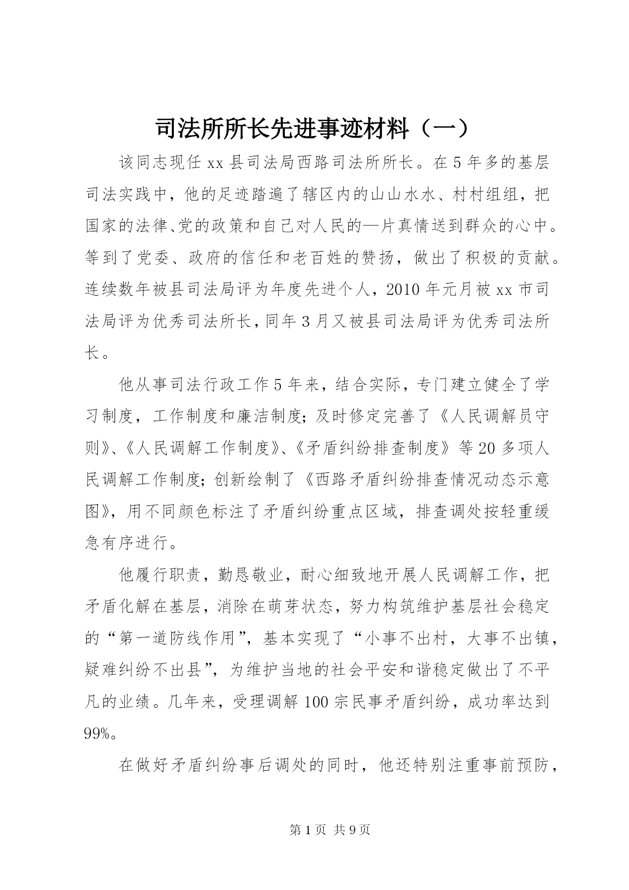 第PAGE\*Arabic\*MERGEFORMAT9页共NUMPAGES\*MERGEFORMAT9页司法所所长先进事迹材料(一)该同志现任xx县司法局西路司法所所长。在5年多的基层司法实践中,他的足迹踏遍了辖区内的山山水水、村村组组,把国家的法律、党的政策和自己对人民的—片真情送到群众的心中。等到了党委、政府的信任和老百姓的赞扬,做出了积极的贡献。连续数年被县司法局评为年度先进个人,2010年元月被xx市司法局评为优秀司法所长,同年3月又被县司法局评为优秀司法所长。他从事司法行政工作5年来