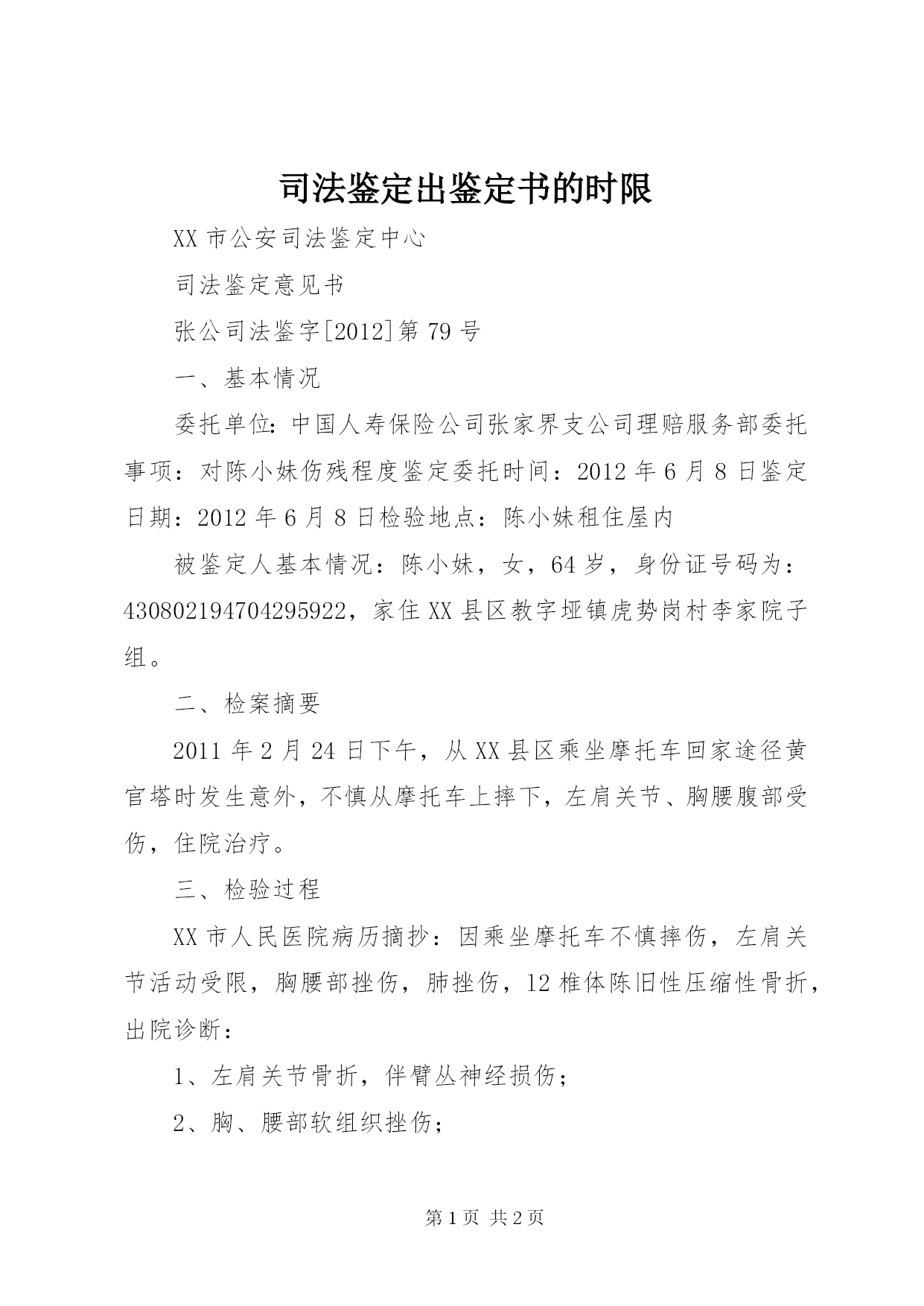 第PAGE\*Arabic\*MERGEFORMAT2页共NUMPAGES\*MERGEFORMAT2页司法鉴定出鉴定书的时限XX市公安司法鉴定中心司法鉴定意见书张公司法鉴字[2012]第79号一、基本情况委托单位:中国人寿保险公司张家界支公司理赔服务部委托事项:对陈小妹伤残程度鉴定委托时间:2012年6月8日鉴定日期:2012年6月8日检验地点:陈小妹租住屋内被鉴定人基本情况:陈小妹,女,64岁,身份证号码为:430802194704295922,家住XX县区教字垭镇虎势岗村李家院子组。二、