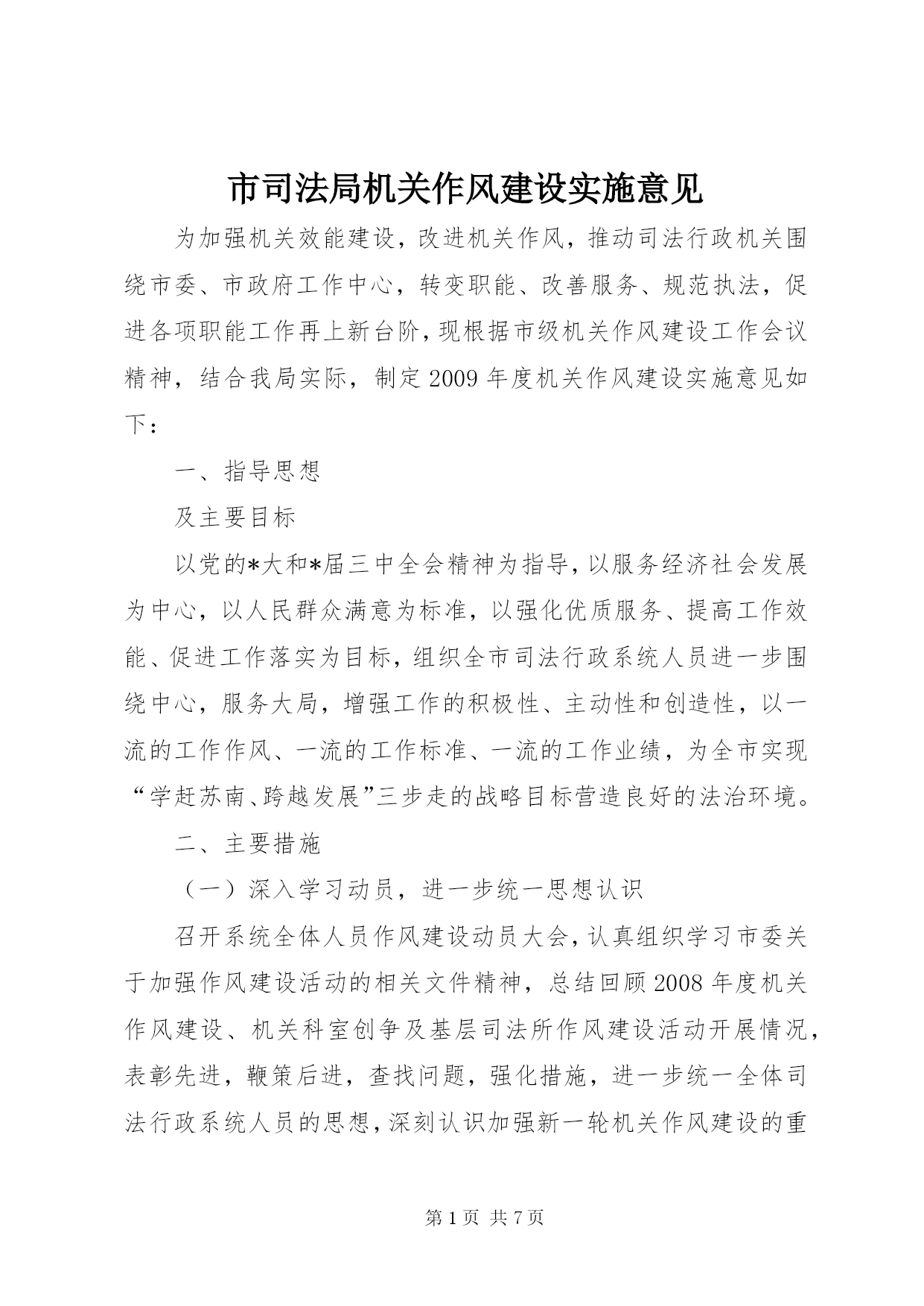 第PAGE\*Arabic\*MERGEFORMAT7页共NUMPAGES\*MERGEFORMAT7页市司法局机关作风建设实施意见为加强机关效能建设,改进机关作风,推动司法行政机关围绕市委、市政府工作中心,转变职能、改善服务、规范执法,促进各项职能工作再上新台阶,现根据市级机关作风建设工作会议精神,结合我局实际,制定2009年度机关作风建设实施意见如下:一、指导思想及主要目标以党的*大和*届三中全会精神为指导,以服务经济社会发展为中心,以人民群众满意为标准,以强化优质服务、提高工作效能、促进