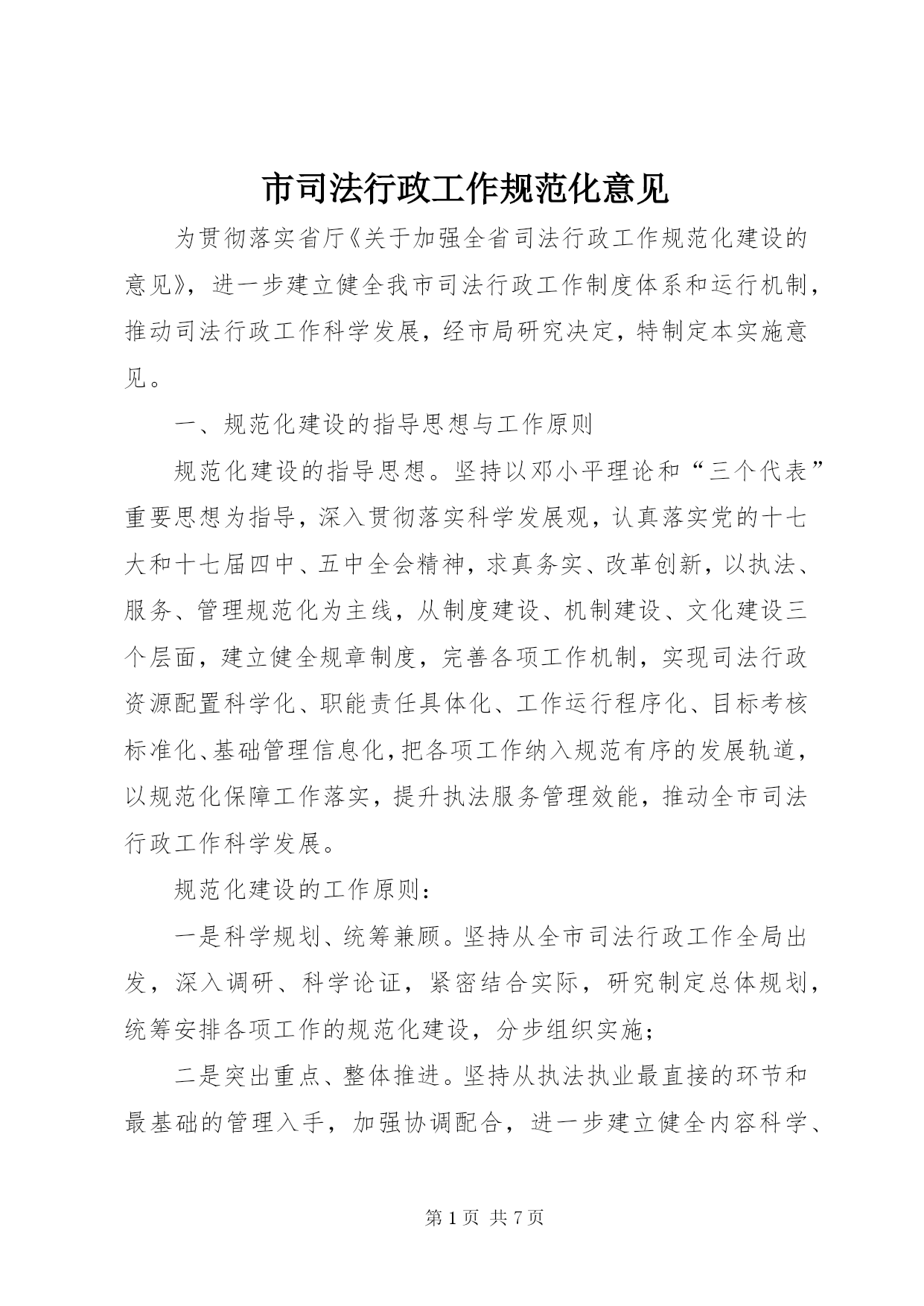 第PAGE\*Arabic\*MERGEFORMAT7页共NUMPAGES\*MERGEFORMAT7页市司法行政工作规范化意见为贯彻落实省厅《关于加强全省司法行政工作规范化建设的意见》,进一步建立健全我市司法行政工作制度体系和运行机制,推动司法行政工作科学发展,经市局研究决定,特制定本实施意见。一、规范化建设的指导思想与工作原则规范化建设的指导思想。坚持以邓小平理论和“三个代表”重要思想为指导,深入贯彻落实科学发展观,认真落实党的十七大和十七届四中、五中全会精神,求真务实、改革创新,以执法、
