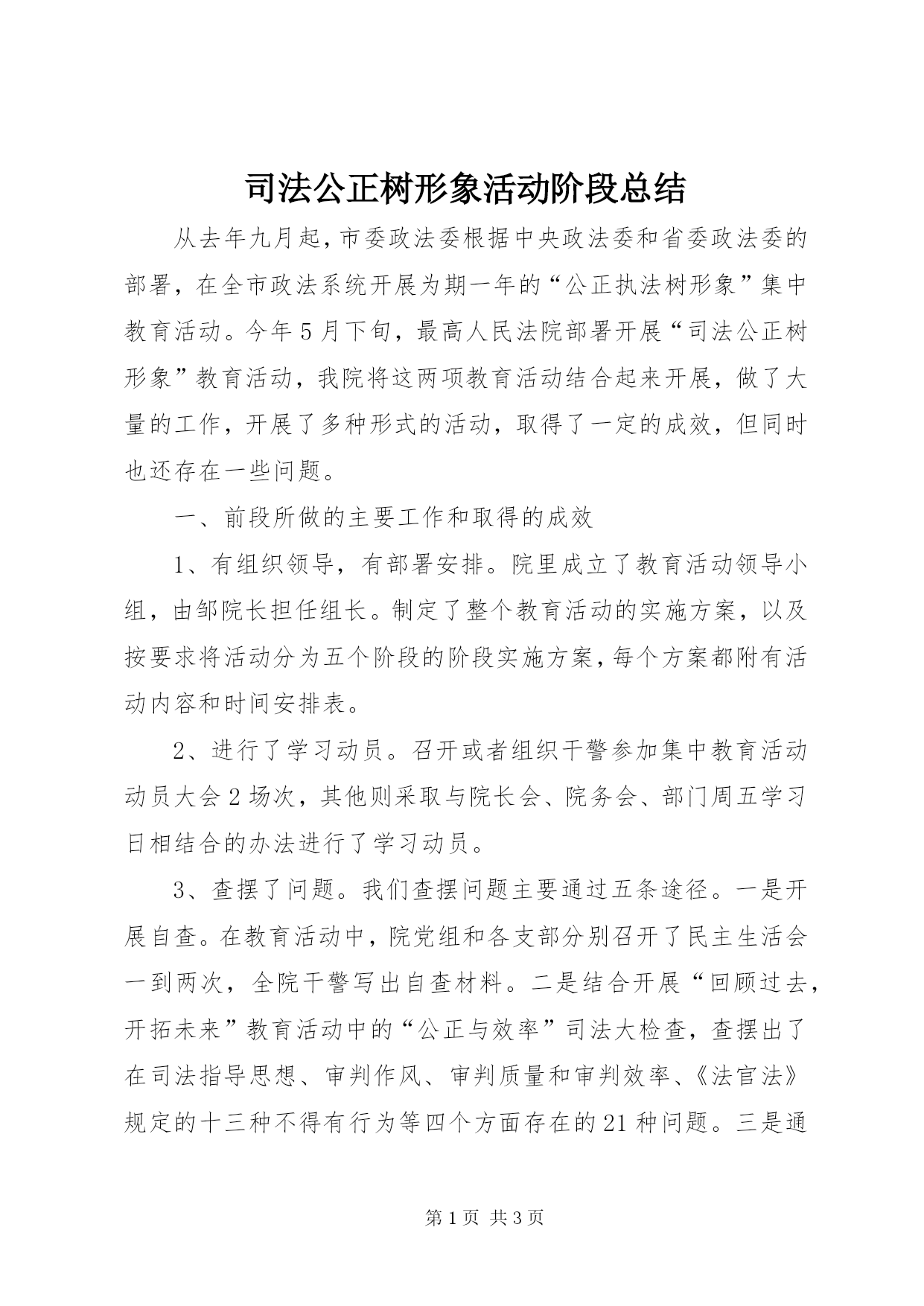 第PAGE\*Arabic\*MERGEFORMAT3页共NUMPAGES\*MERGEFORMAT3页司法公正树形象活动阶段总结从去年九月起,市委政法委根据中央政法委和省委政法委的部署,在全市政法系统开展为期一年的“公正执法树形象”集中教育活动。今年5月下旬,最高人民法院部署开展“司法公正树形象”教育活动,我院将这两项教育活动结合起来开展,做了大量的工作,开展了多种形式的活动,取得了一定的成效,但同时也还存在一些问题。一、前段所做的主要工作和取得的成效1、有组织领导,有部署安排。院里成立了教