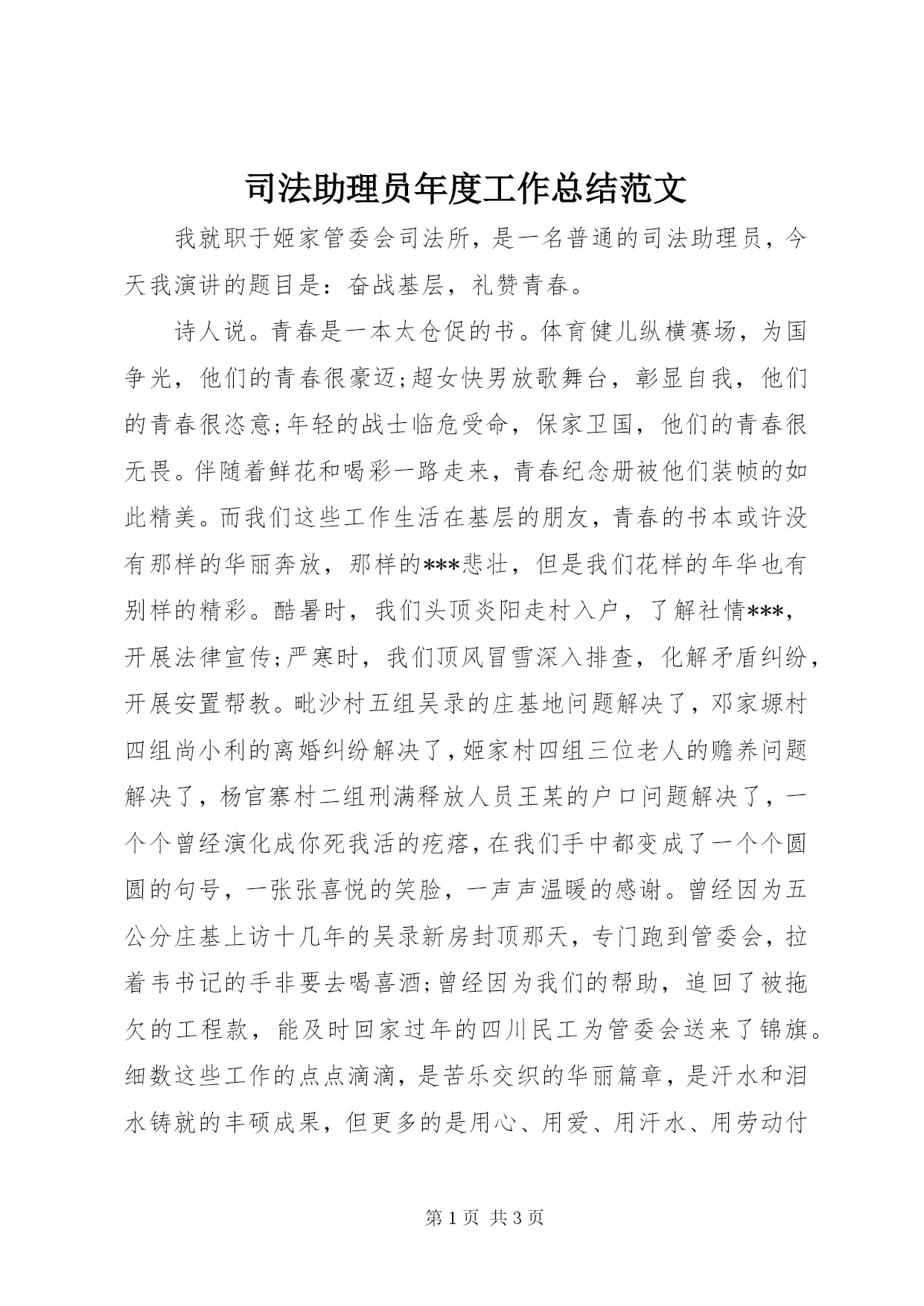 第PAGE\*Arabic\*MERGEFORMAT3页共NUMPAGES\*MERGEFORMAT3页司法助理员年度工作总结范文我就职于姬家管委会司法所,是一名普通的司法助理员,今天我演讲的题目是:奋战基层,礼赞青春。诗人说。青春是一本太仓促的书。体育健儿纵横赛场,为国争光,他们的青春很豪迈;超女快男放歌舞台,彰显自我,他们的青春很恣意;年轻的战士临危受命,保家卫国,他们的青春很无畏。伴随着鲜花和喝彩一路走来,青春纪念册被他们装帧的如此精美。而我们这些工作生活在基层的朋友,青春的书本或许没有