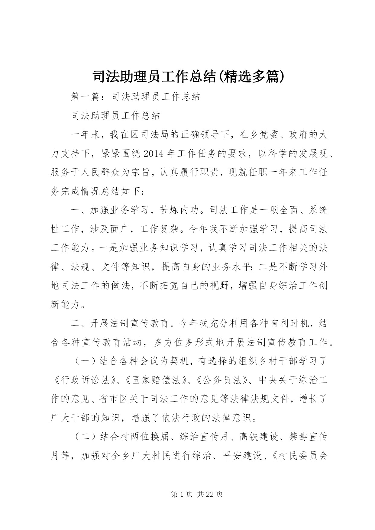 第PAGE\*Arabic\*MERGEFORMAT22页共NUMPAGES\*MERGEFORMAT22页司法助理员工作总结(精选多篇)第一篇:司法助理员工作总结司法助理员工作总结一年来,我在区司法局的正确领导下,在乡党委、政府的大力支持下,紧紧围绕2014年工作任务的要求,以科学的发展观、服务于人民群众为宗旨,认真履行职责,现就任职一年来工作任务完成情况总结如下:一、加强业务学习,苦炼内功。司法工作是一项全面、系统性工作,涉及面广,工作复杂。今年我不断加强学习,提高司法工作能力。一是加强业