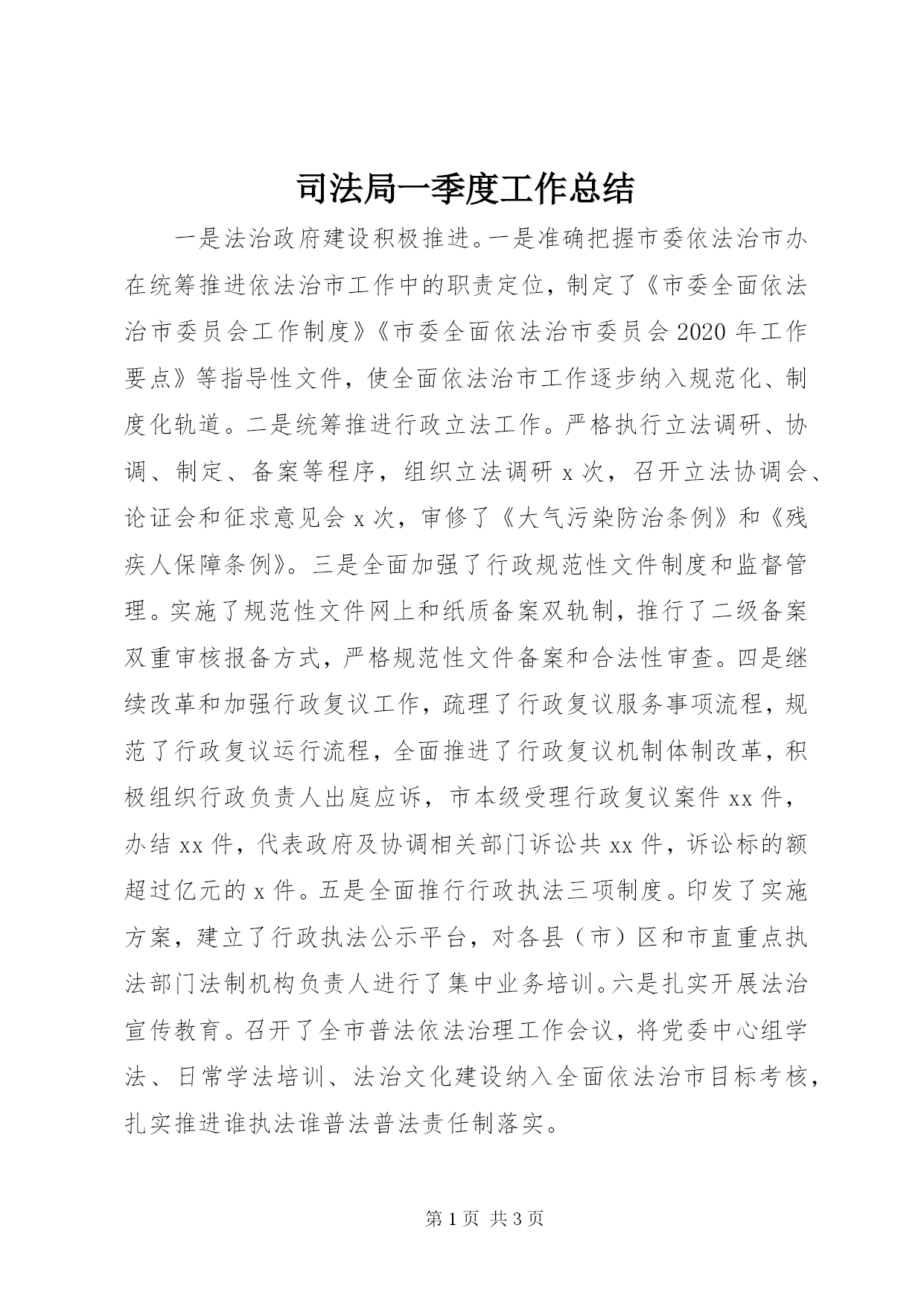 第PAGE\*Arabic\*MERGEFORMAT3页共NUMPAGES\*MERGEFORMAT3页司法局一季度工作总结一是法治政府建设积极推进。一是准确把握市委依法治市办在统筹推进依法治市工作中的职责定位,制定了《市委全面依法治市委员会工作制度》《市委全面依法治市委员会2020年工作要点》等指导性文件,使全面依法治市工作逐步纳入规范化、制度化轨道。二是统筹推进行政立法工作。严格执行立法调研、协调、制定、备案等程序,组织立法调研x次,召开立法协调会、论证会和征求意见会x次,审修了《大气污染