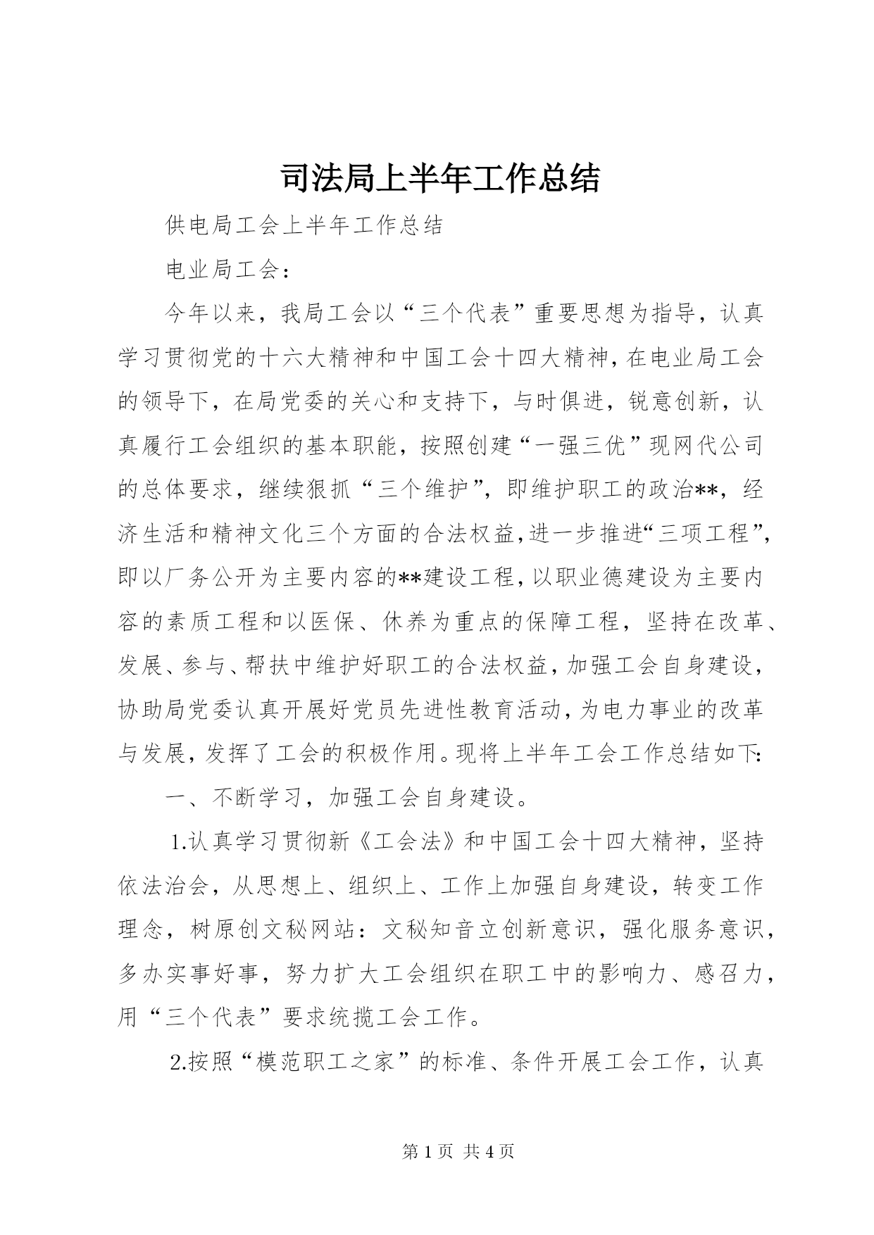 第PAGE\*Arabic\*MERGEFORMAT4页共NUMPAGES\*MERGEFORMAT4页司法局上半年工作总结供电局工会上半年工作总结电业局工会:今年以来,我局工会以“三个代表”重要思想为指导,认真学习贯彻党的十六大精神和中国工会十四大精神,在电业局工会的领导下,在局党委的关心和支持下,与时俱进,锐意创新,认真履行工会组织的基本职能,按照创建“一强三优”现网代公司的总体要求,继续狠抓“三个维护”,即维护职工的政治**,经济生活和精神文化三个方面的合法权益,进一步推进“三项工程”,