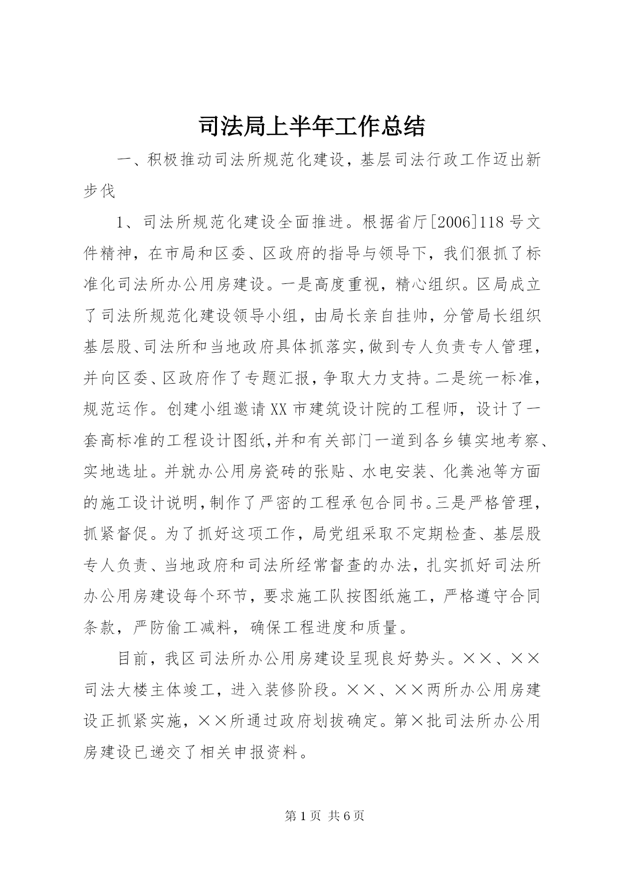 第PAGE\*Arabic\*MERGEFORMAT6页共NUMPAGES\*MERGEFORMAT6页司法局上半年工作总结一、积极推动司法所规范化建设,基层司法行政工作迈出新步伐1、司法所规范化建设全面推进。根据省厅[2006]118号文件精神,在市局和区委、区政府的指导与领导下,我们狠抓了标准化司法所办公用房建设。一是高度重视,精心组织。区局成立了司法所规范化建设领导小组,由局长亲自挂帅,分管局长组织基层股、司法所和当地政府具体抓落实,做到专人负责专人管理,并向区委、区政府作了专题汇报,争