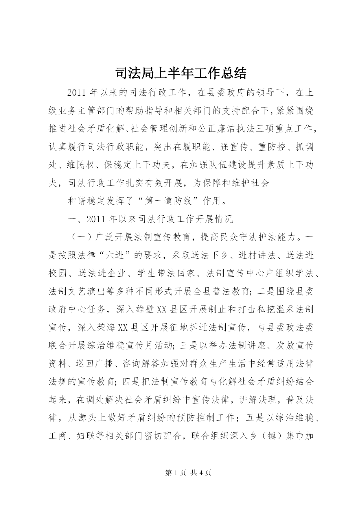 第PAGE\*Arabic\*MERGEFORMAT4页共NUMPAGES\*MERGEFORMAT4页司法局上半年工作总结2011年以来的司法行政工作,在县委政府的领导下,在上级业务主管部门的帮助指导和相关部门的支持配合下,紧紧围绕推进社会矛盾化解、社会管理创新和公正廉洁执法三项重点工作,认真履行司法行政职能,突出在履职能、强宣传、重防控、抓调处、维民权、保稳定上下功夫,在加强队伍建设提升素质上下功夫,司法行政工作扎实有效开展,为保障和维护社会和谐稳定发挥了“第一道防线”作用。一、2011年