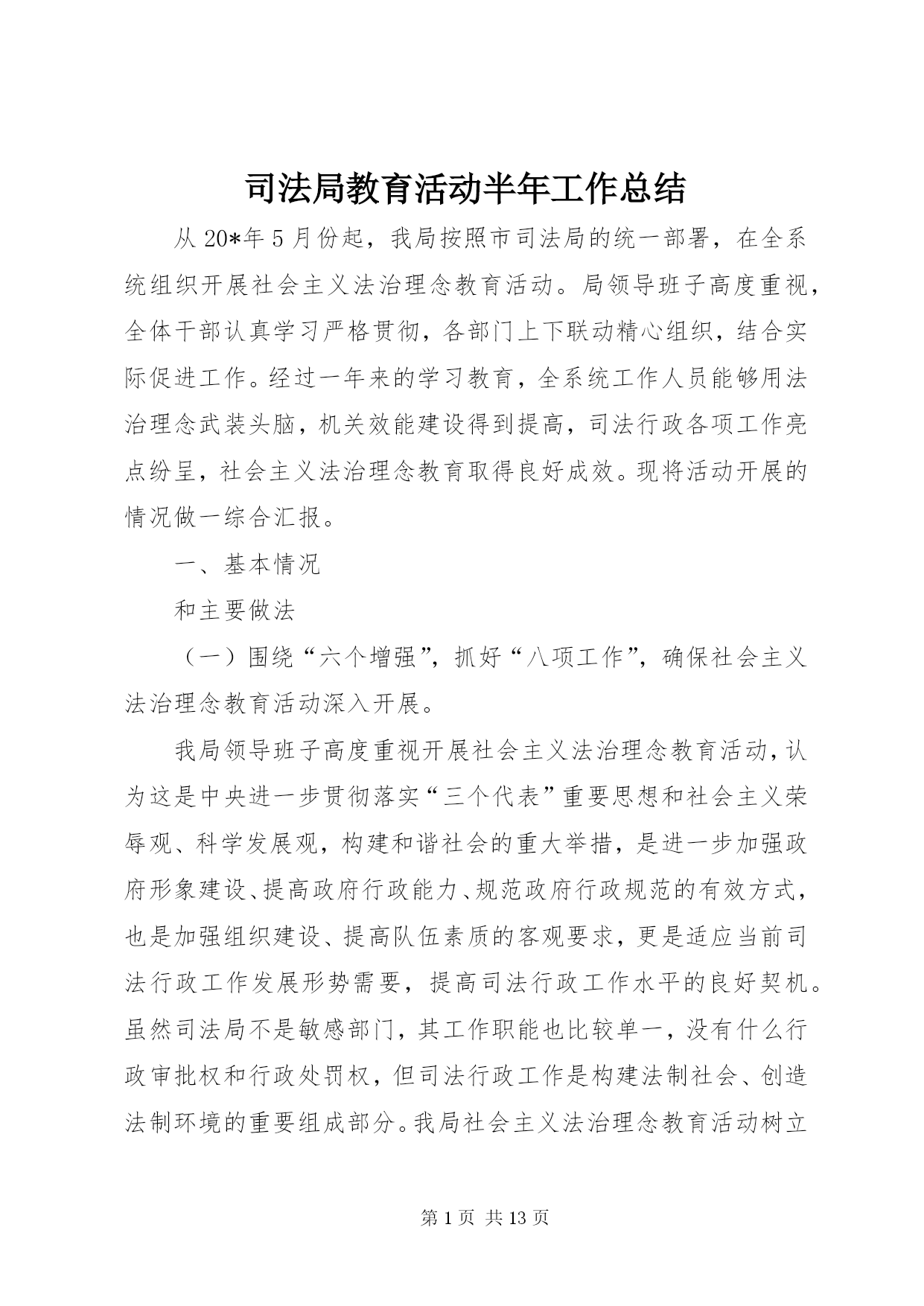 第PAGE\*Arabic\*MERGEFORMAT13页共NUMPAGES\*MERGEFORMAT13页司法局教育活动半年工作总结从20*年5月份起,我局按照市司法局的统一部署,在全系统组织开展社会主义法治理念教育活动。局领导班子高度重视,全体干部认真学习严格贯彻,各部门上下联动精心组织,结合实际促进工作。经过一年来的学习教育,全系统工作人员能够用法治理念武装头脑,机关效能建设得到提高,司法行政各项工作亮点纷呈,社会主义法治理念教育取得良好成效。现将活动开展的情况做一综合汇报。一、基本情况